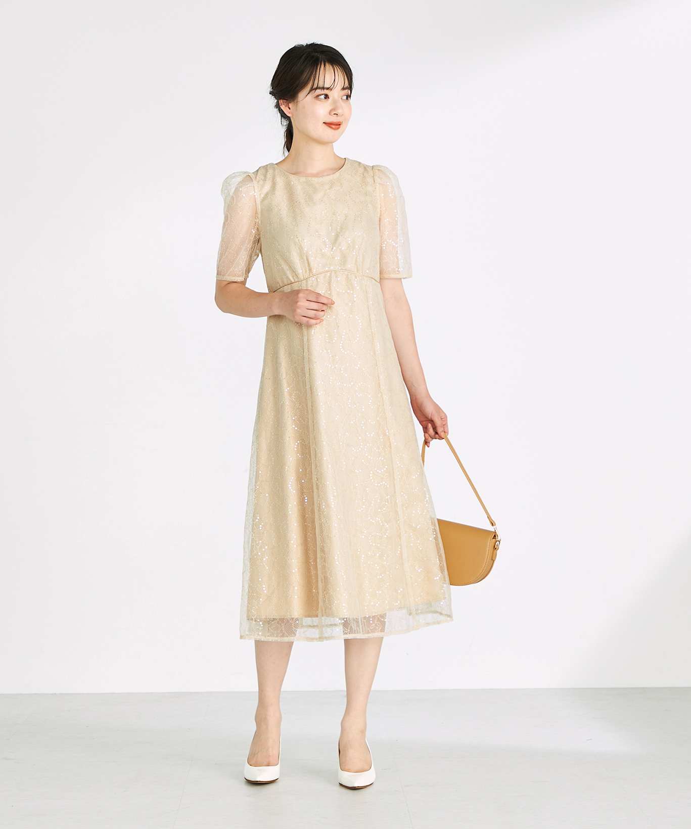 優しいクリームカラーがかわいいドレス。ふんわりシルエットにシアーのパフスリーブがポイントです。