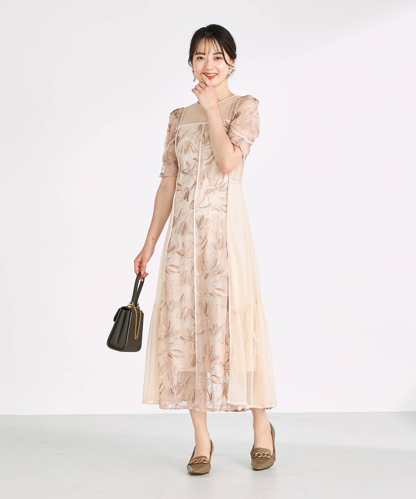 ヌーディーなピンクにシアー素材がかわいいドレス。リーフ模様がナチュラルで柔らかい雰囲気を演出します。