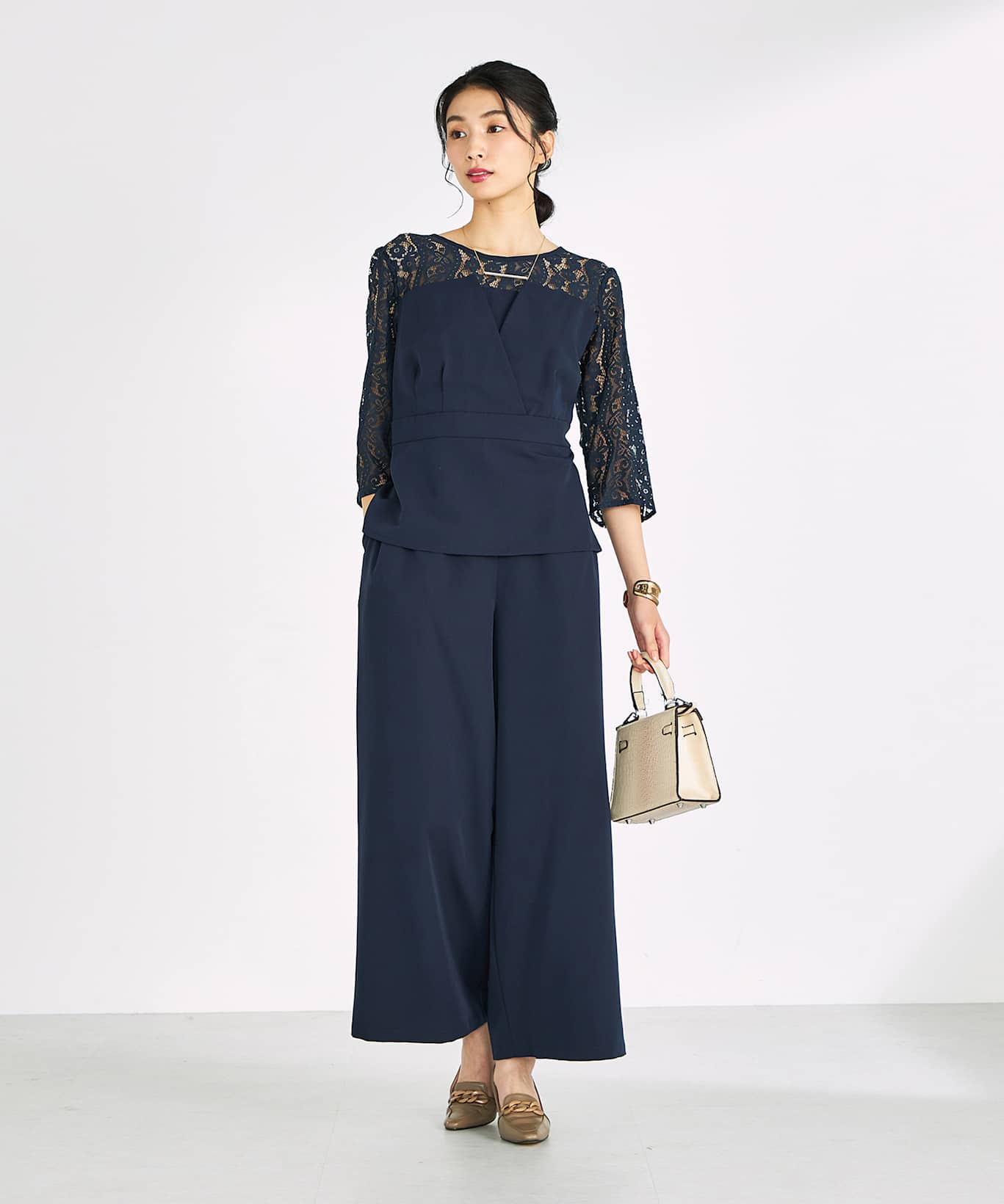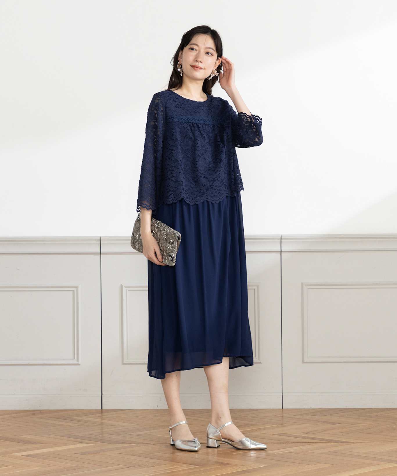 レース×ネイビーの組み合わせが落ち着いた上品な印象に。ゆとりのあるシルエットで体型カバーもしてくれる一着です。