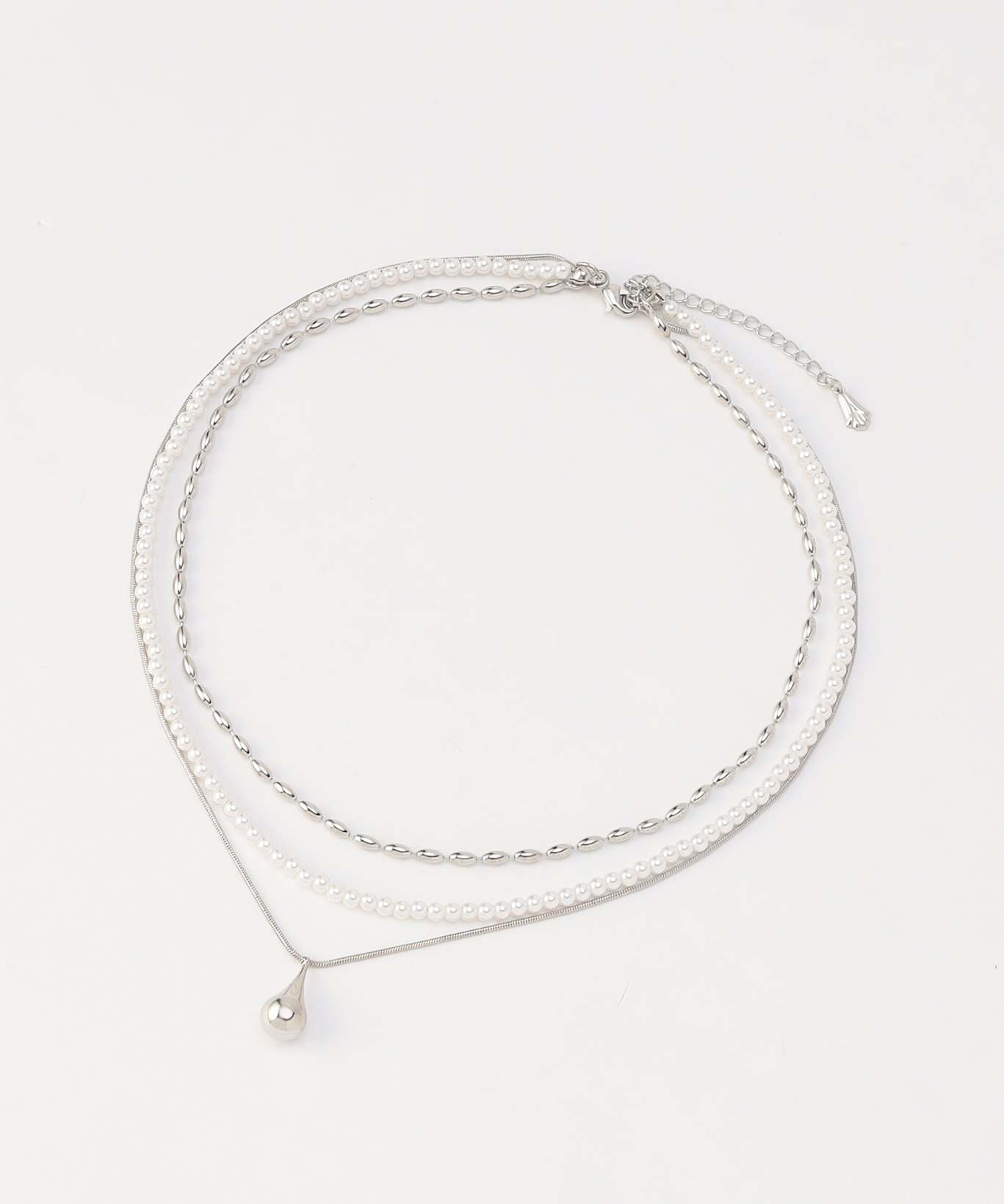 パールやチェーンなど3種類のデザインがまとまった3連ネックレス。フォーマルな場所はもちろん普段使いにも◎