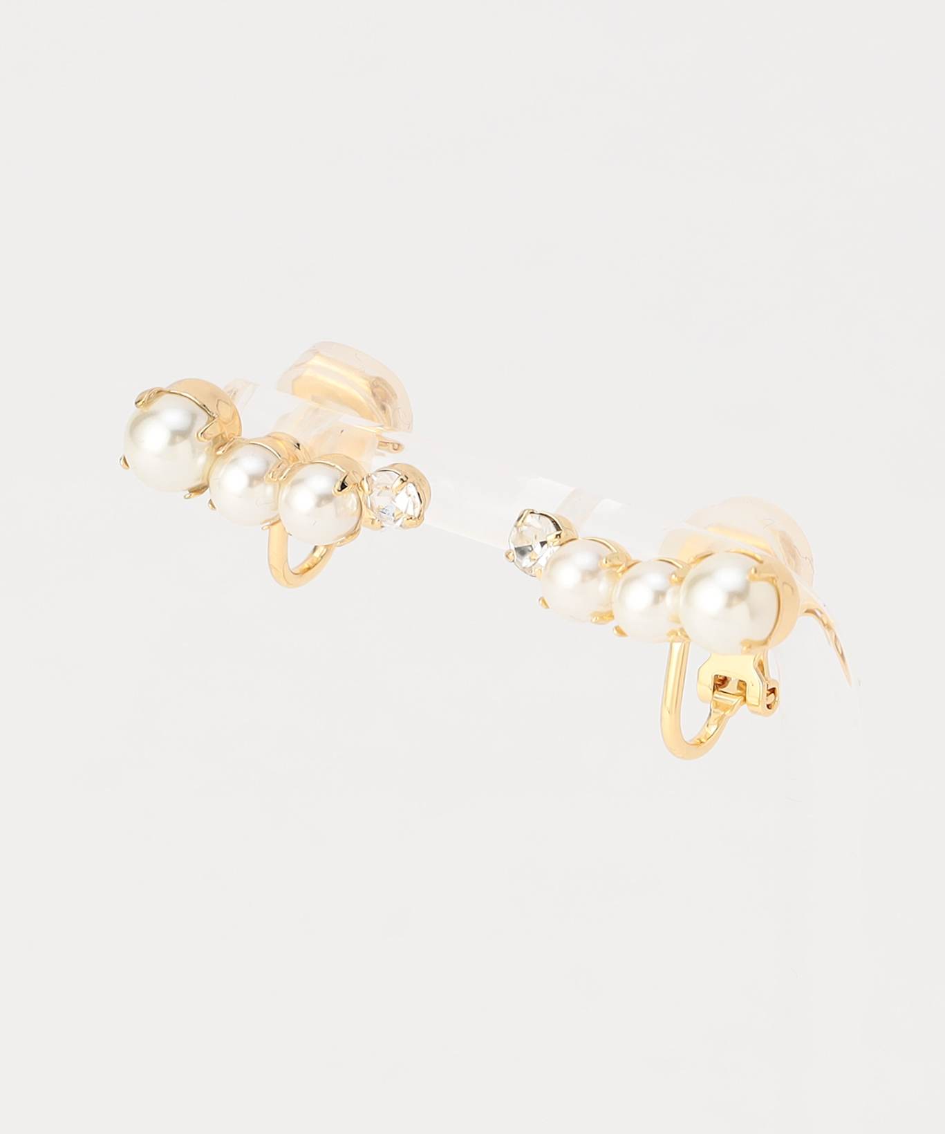 ビジューがアクセントのパールイヤリング。耳に沿う柔らかなデザインが女性らしい印象に。