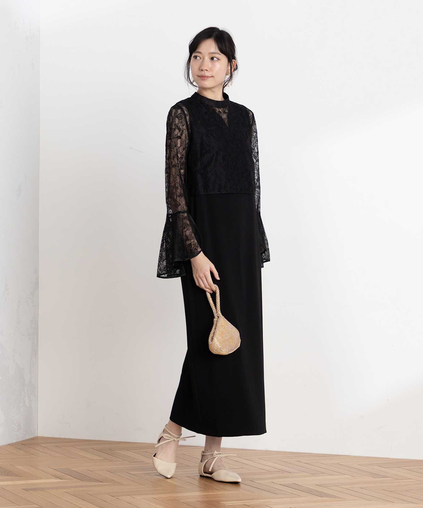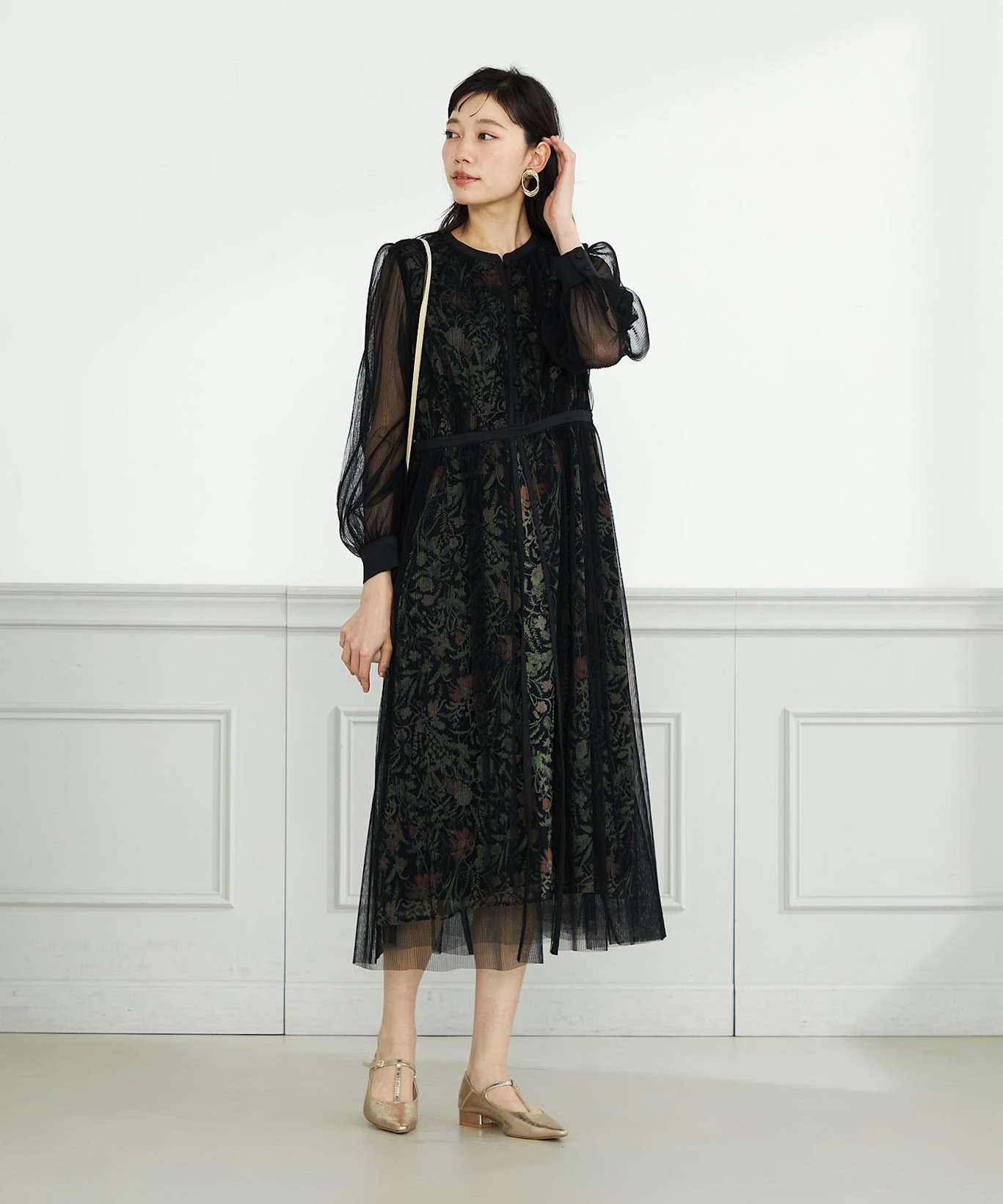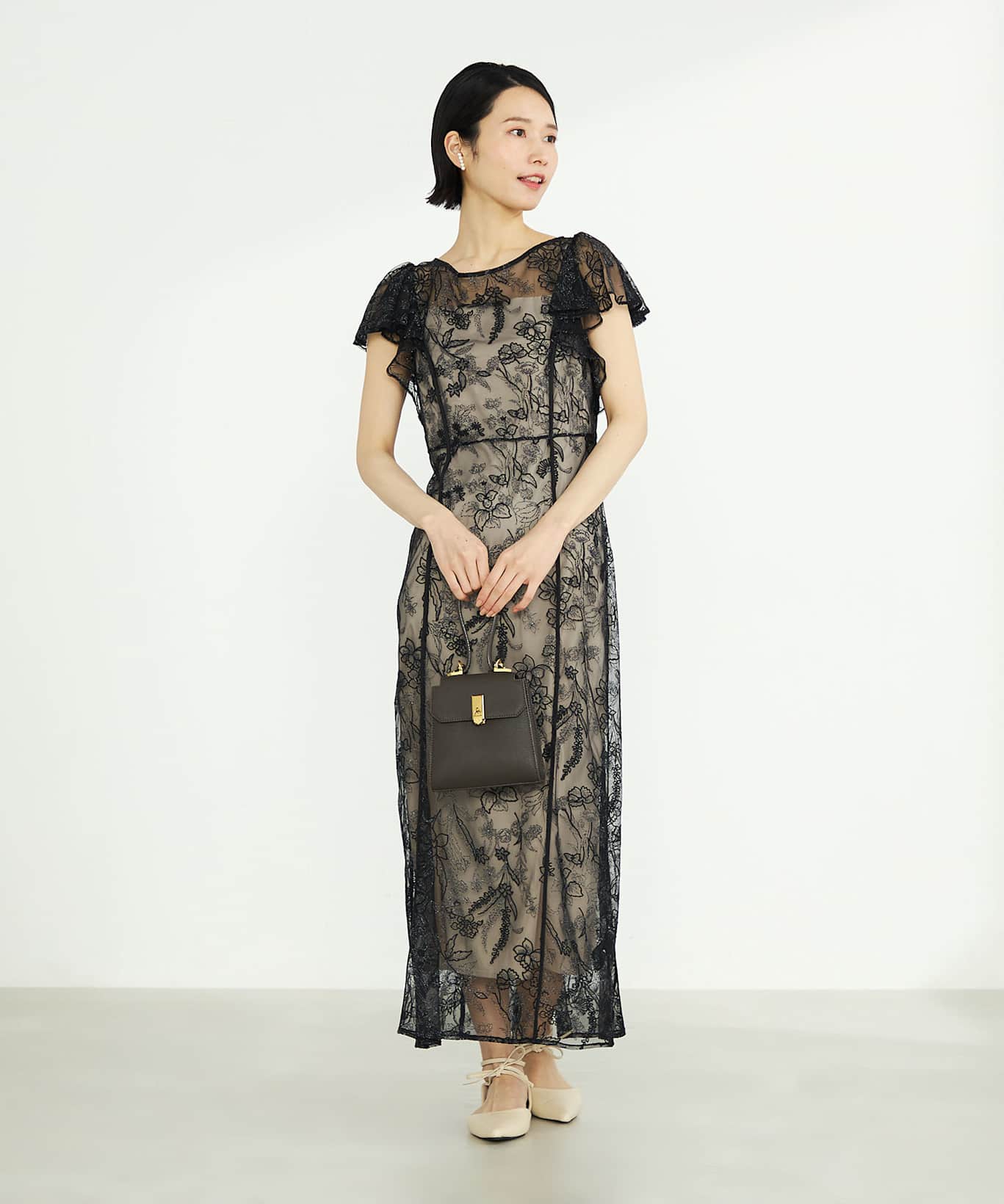 ほどよいシアーのエレガントなドレス。スリーブや裾に抜け感が出ておしゃれ。
