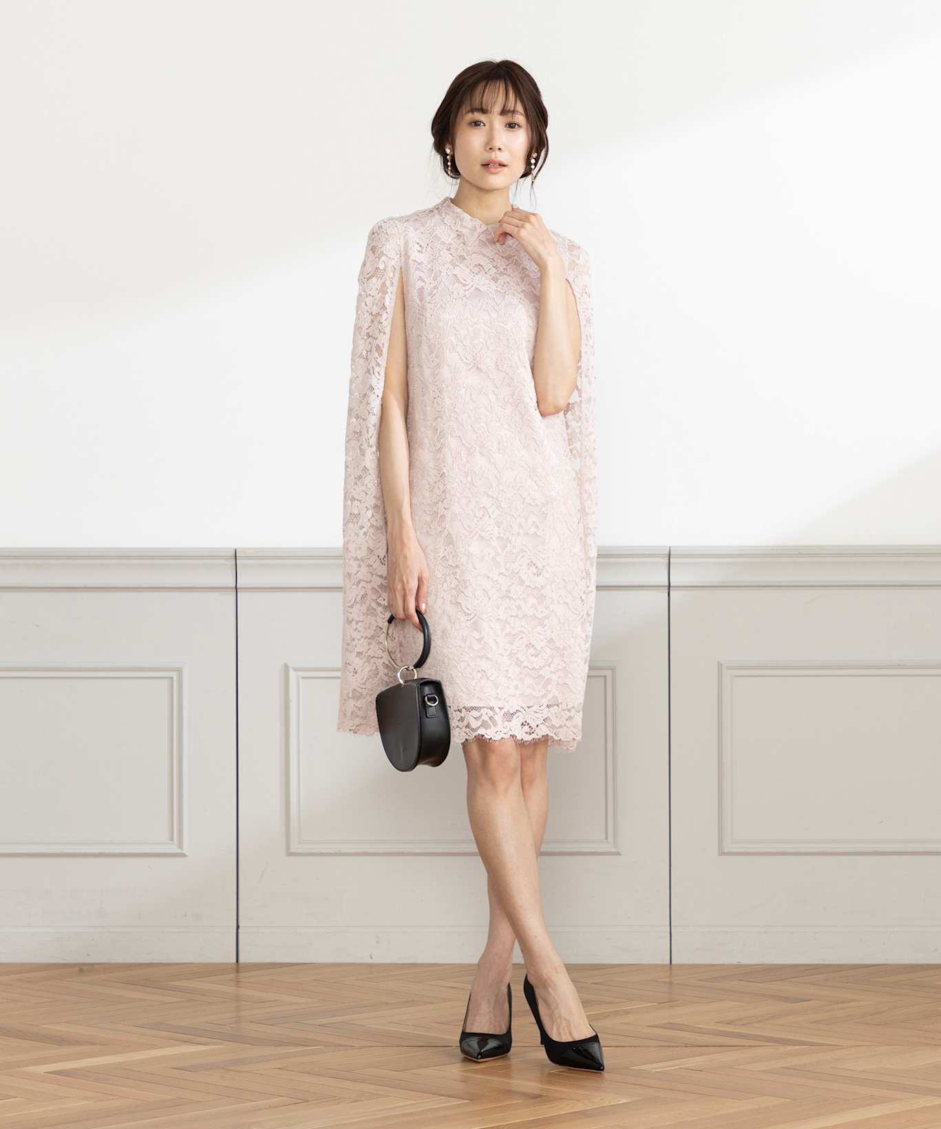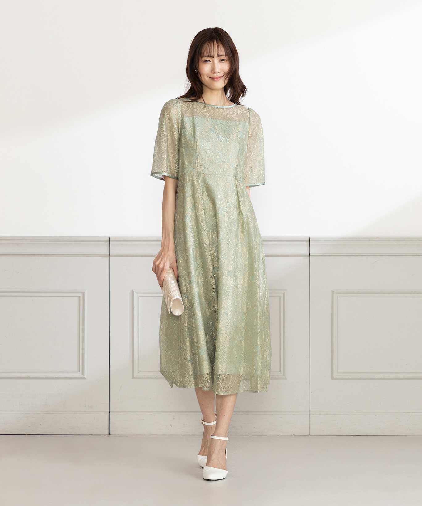フラワーレースが優しい印象を与えるドレス。ふんわりとAラインのシルエットが体のラインをカバーしてくれます。