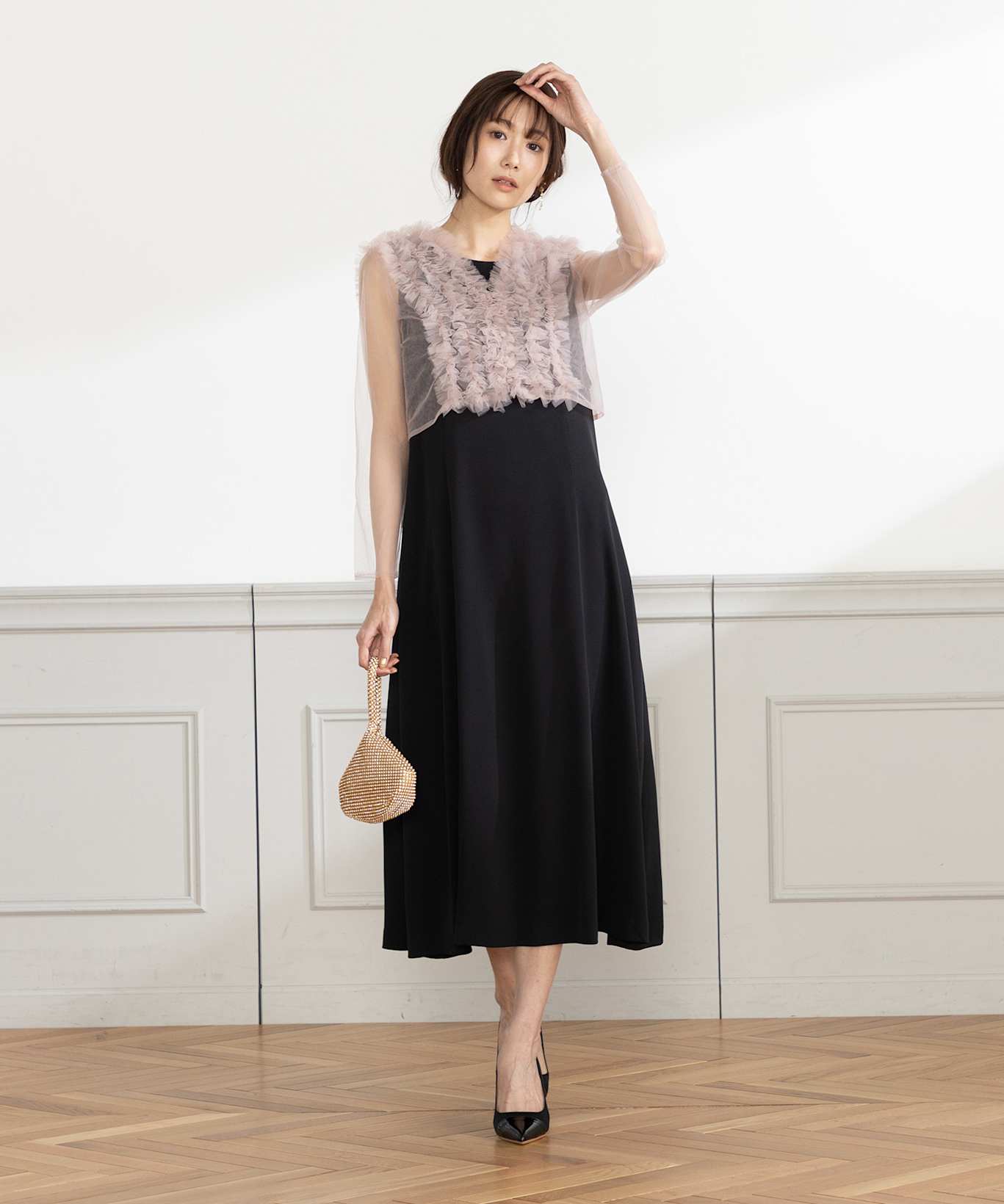 チュールボレロが適度な甘さをプラスしてくれる一着。ブラックのワンピースで甘すぎない印象に。