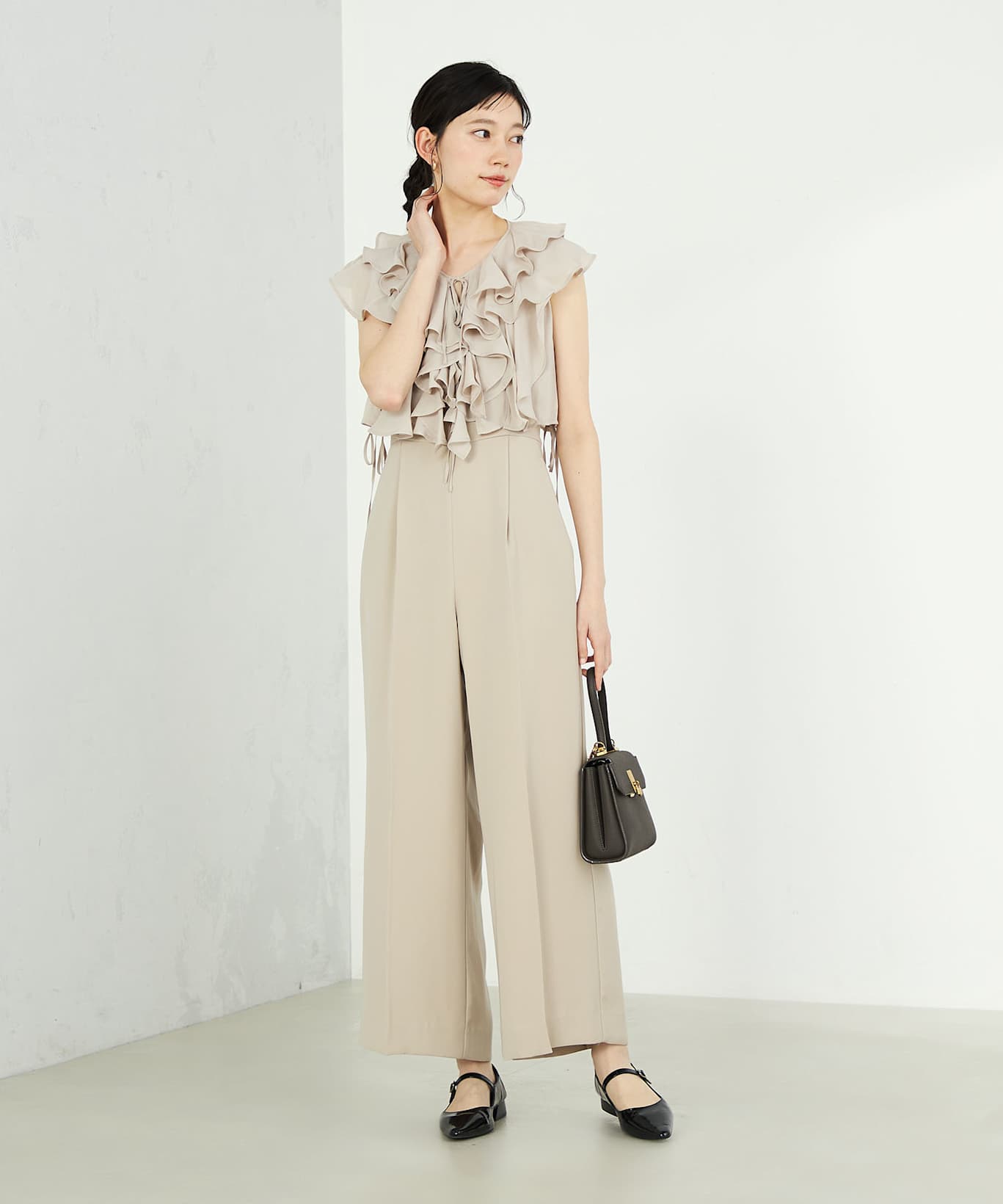 トレンドのフリルがポイントのドレス。パンツスタイルで大人な着こなしに。