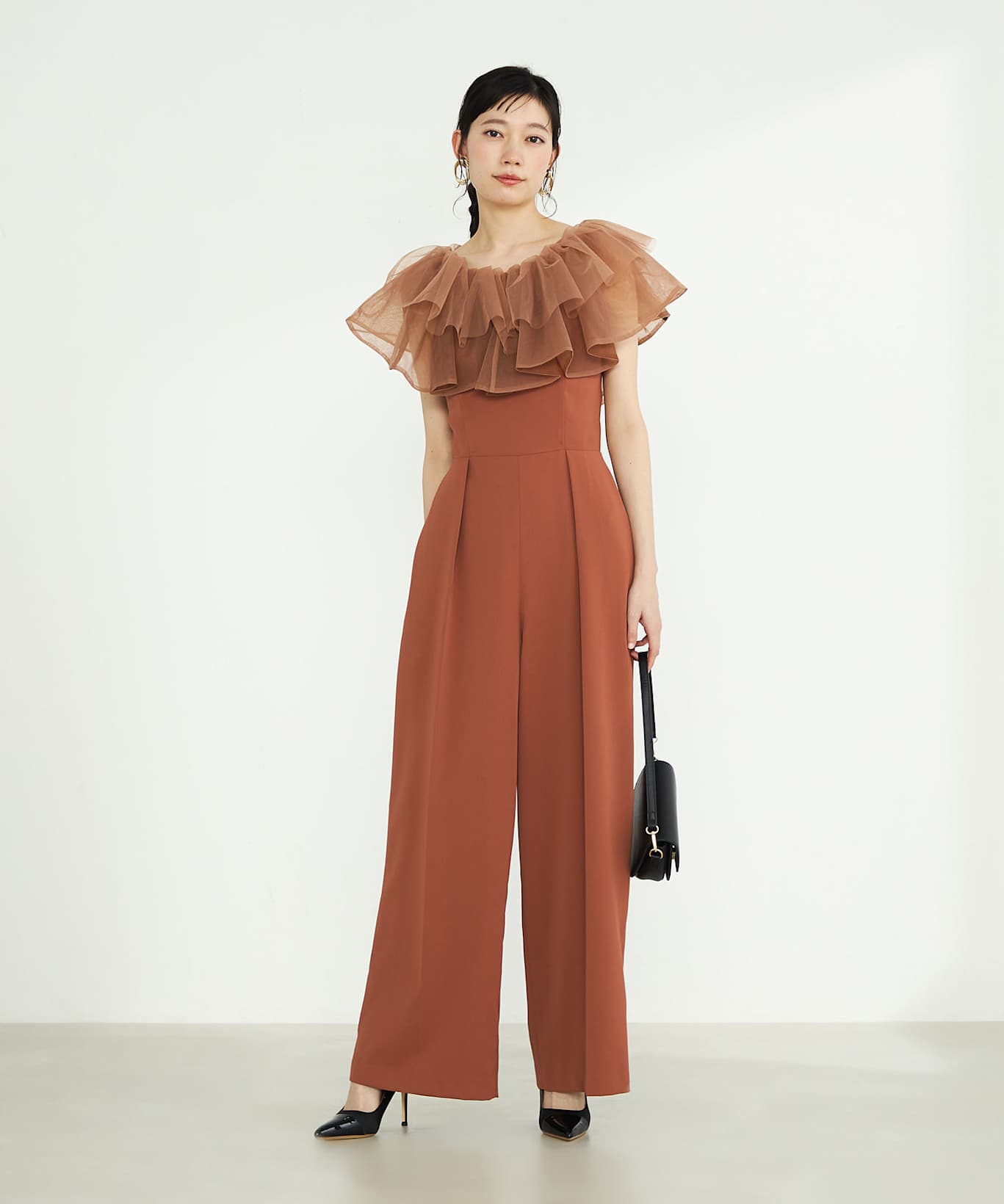 テラコッタオレンジがかわいいパンツドレス。肩周りをカバーするチュールボレロが特徴的でおしゃれ。