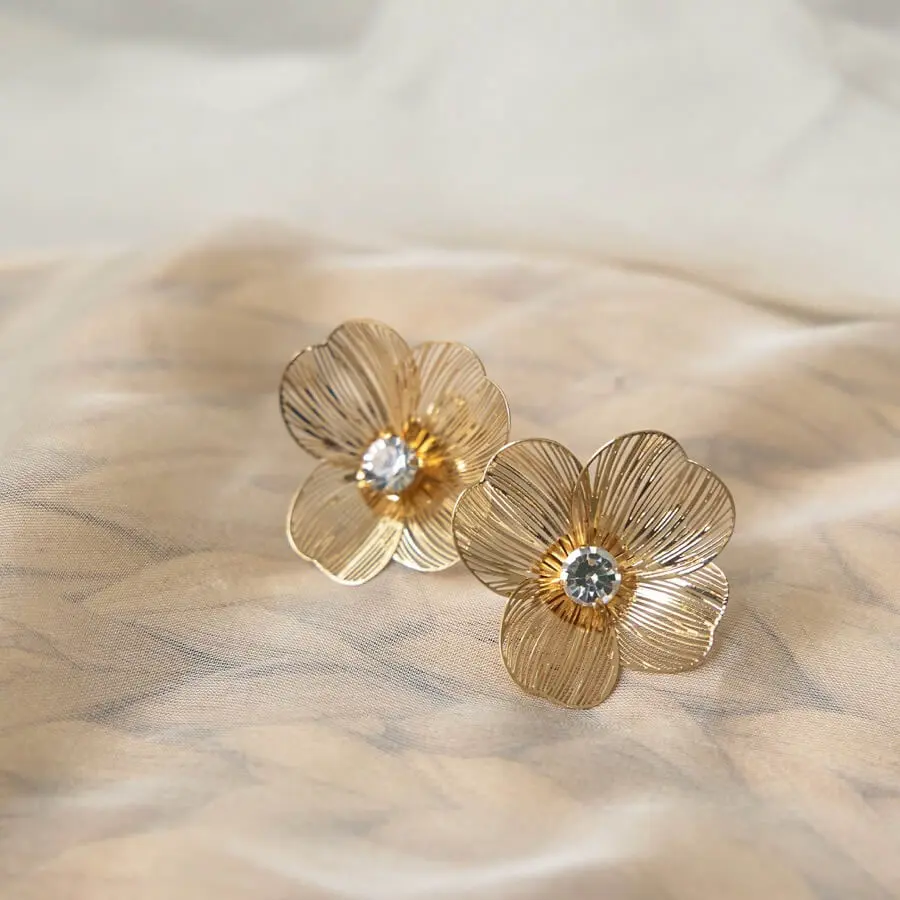 ゴールドのフラワーブーケイヤリング。立体的な大ぶりモチーフが目を引きます。花びらの透け感もポイントです。