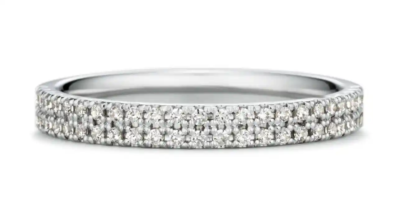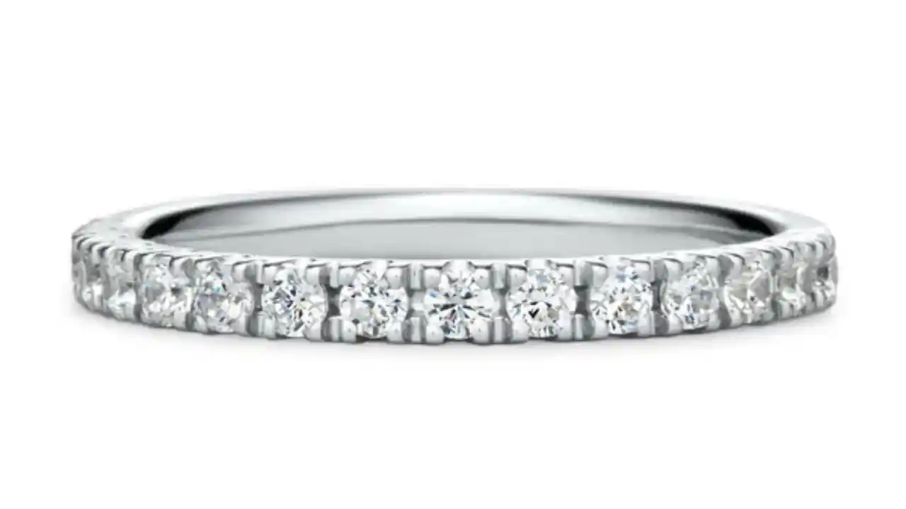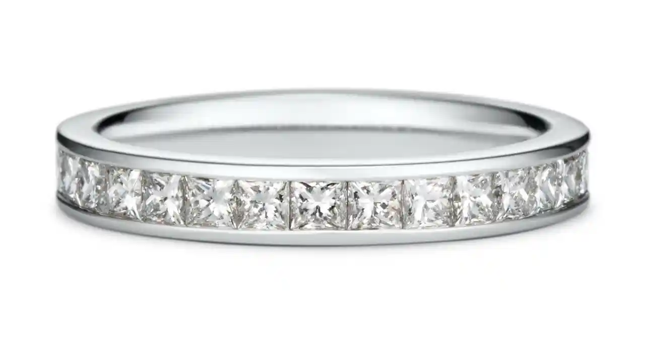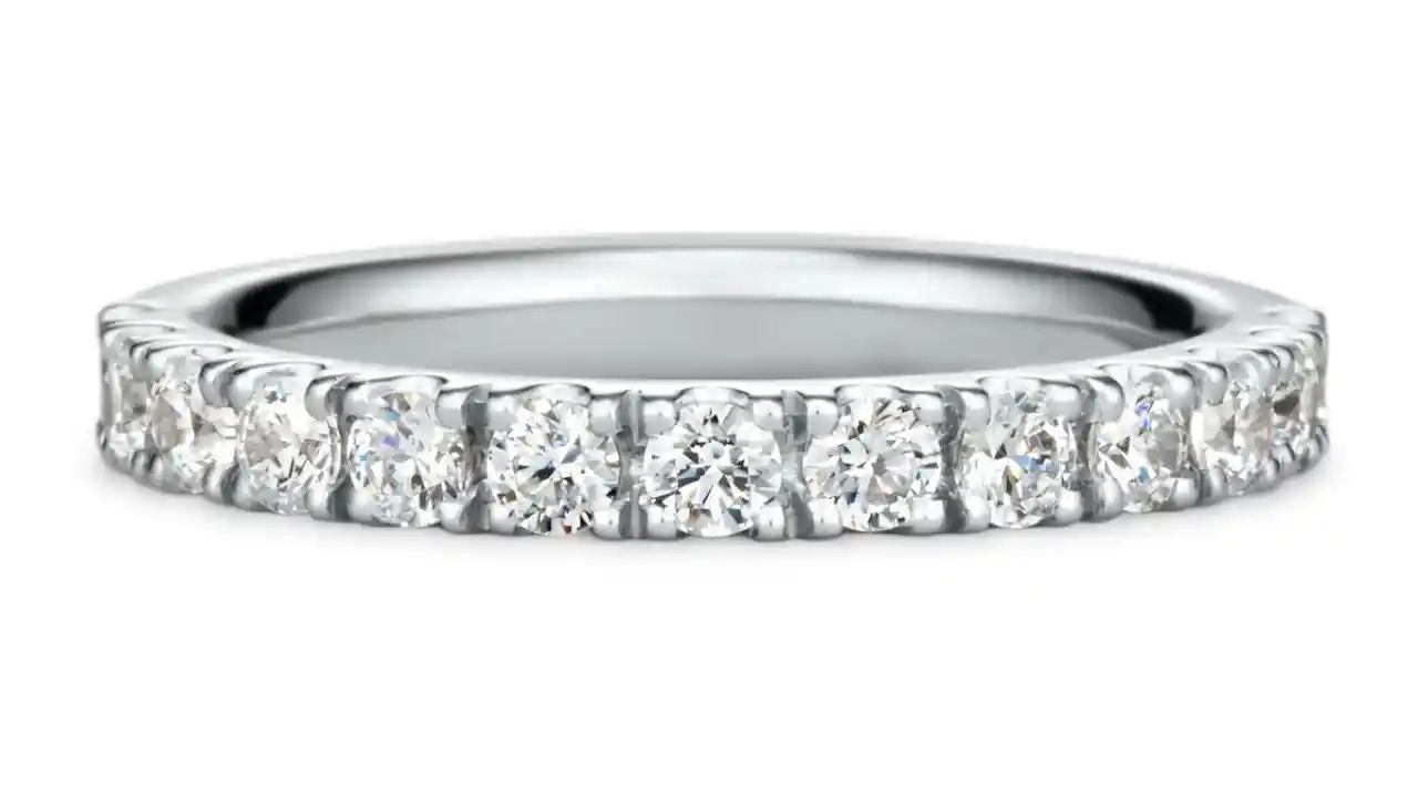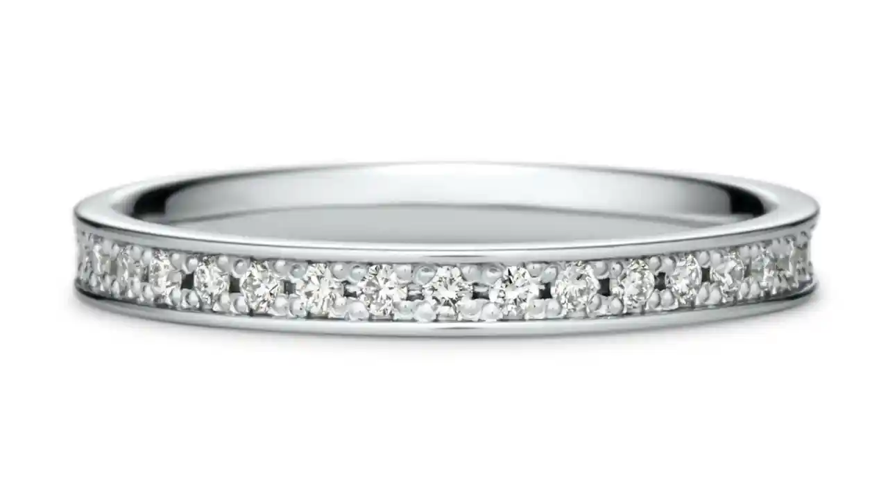 エタニティリングとは、リングのアーム部分全周、または半周に宝石の入った指輪のことです。Eternity(永遠)を語源として「永遠の愛」を意味すると言われています。
