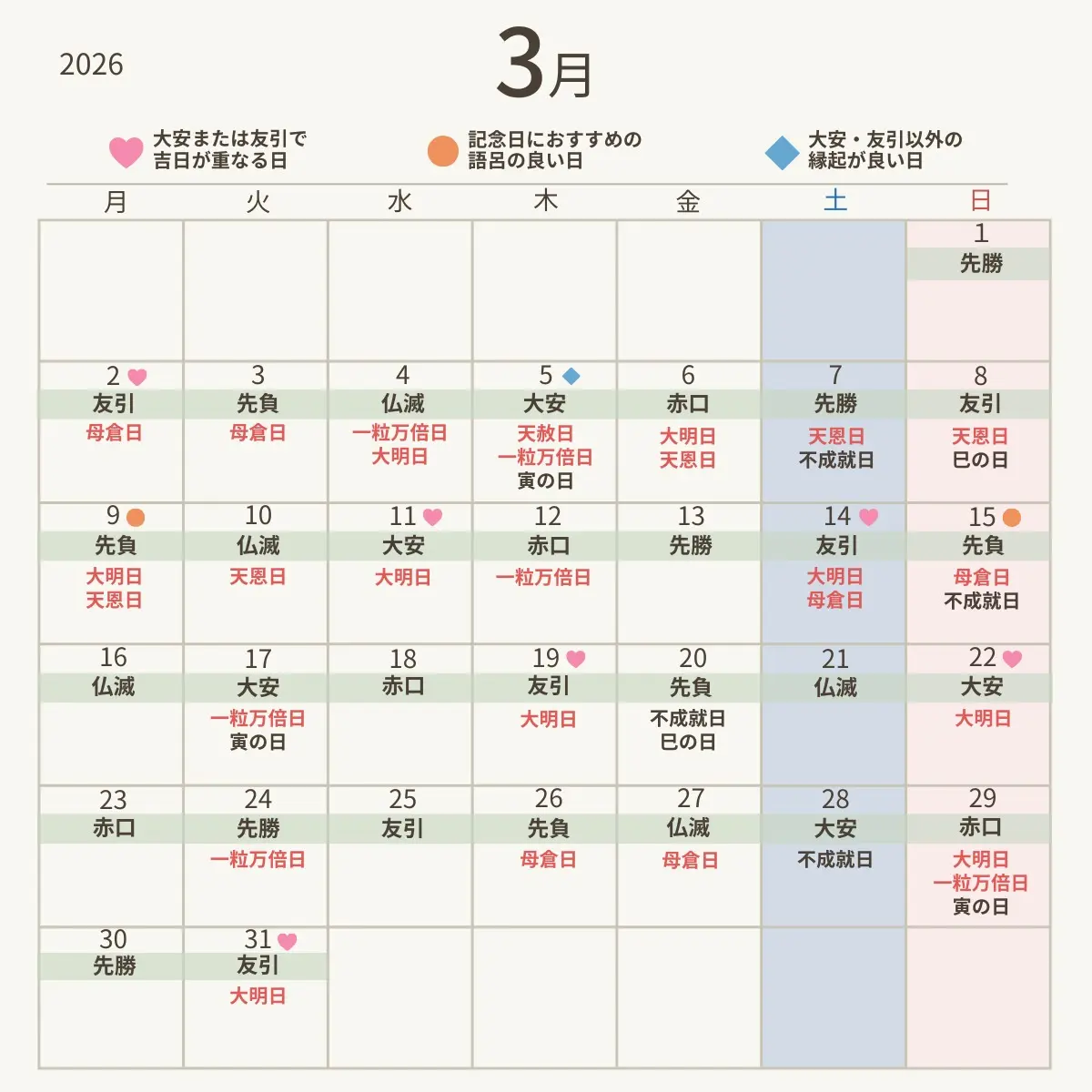 2026年3月のすべての日の吉日、凶日がわかる開運カレンダーはこちらです。