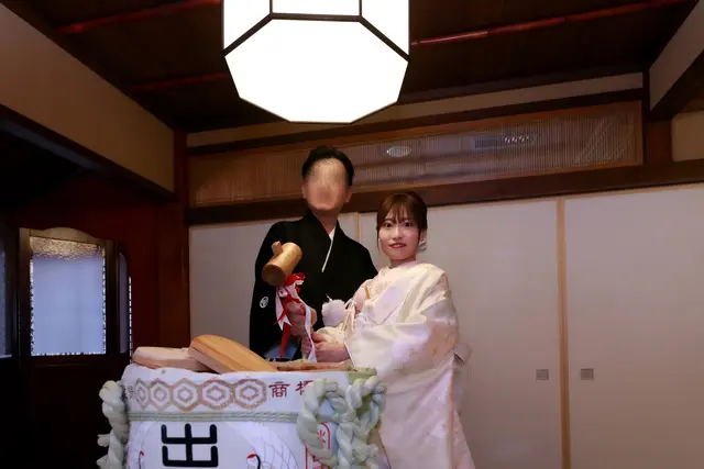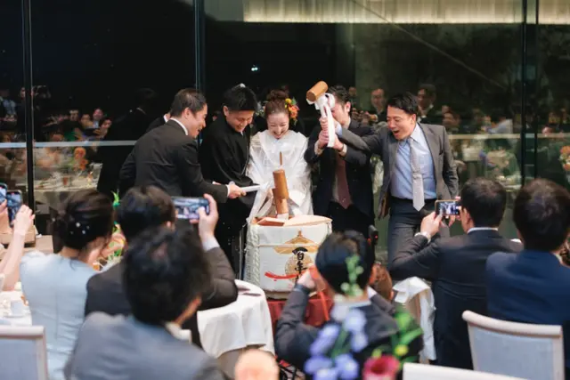新たな門出を祝う鏡開きは、ふたりのハレの日にふさわしい演出。鏡(樽の蓋)を開くことで運を開き、マスに注いで乾杯することでゲストと福を分かち合うという意味があります。