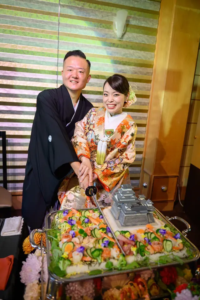ケーキ入刀を和テイストにアレンジ。写真はフルーツの代わりに色とりどりの海鮮をのせたちらし寿司入刀!