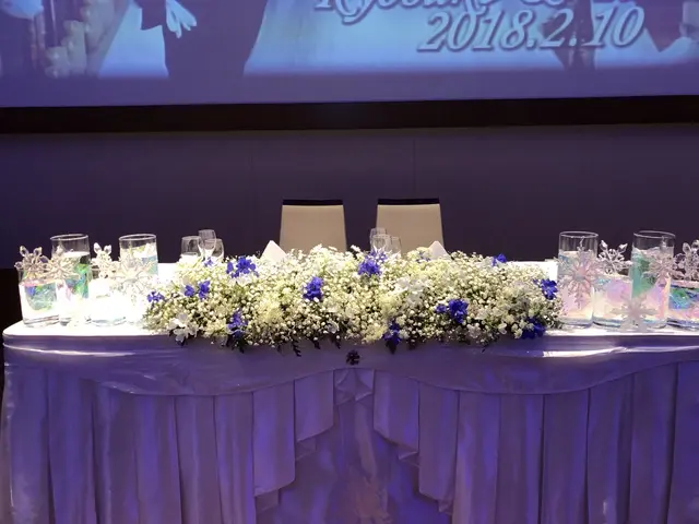 雪を思わせる白の装花に鮮やかなブルーが、冷たく澄んだ冬の空気感をイメージさせるメインテーブル装花。まわりには雪の結晶モチーフを飾って、冬ムードたっぷりに仕上げています。