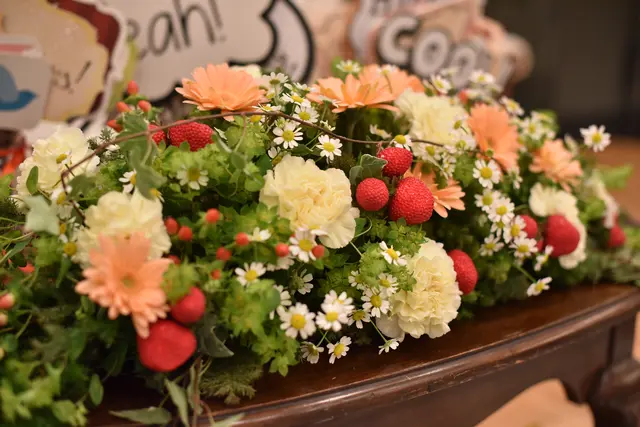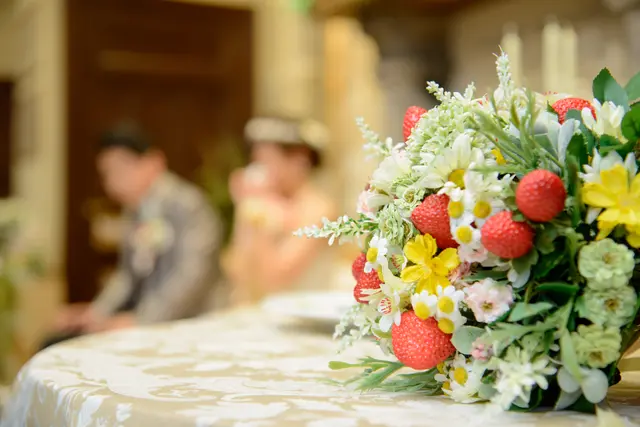 いちごの果実を取り入れた会場装花やブーケはマネしたいアイデア!いちごの花を思わせる白の小花に、真っ赤ないちごの組み合わせがとってもキュート。