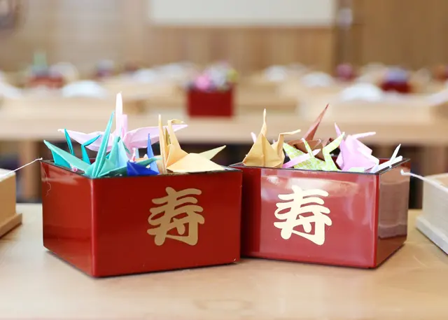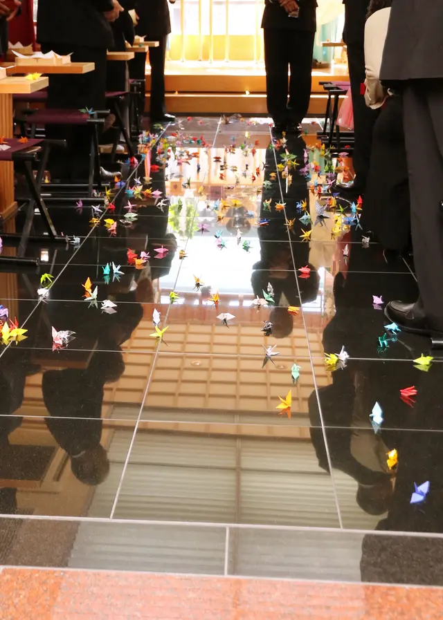 和の挙式には花びらではなく、幸福を願う色とりどりの折り鶴シャワーを。ふたりが通った後もフォトジェニックな写真で残せるのも魅力です。