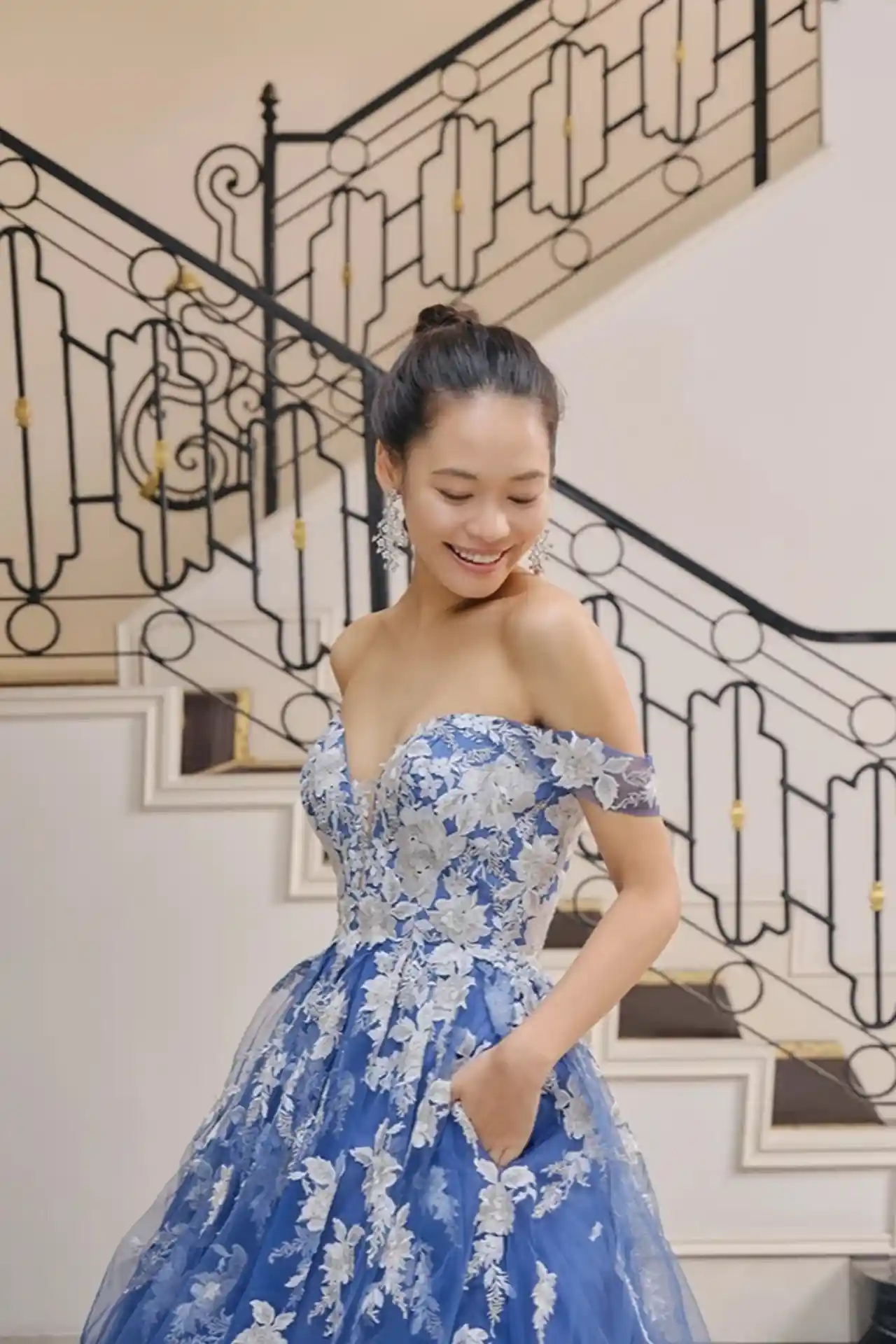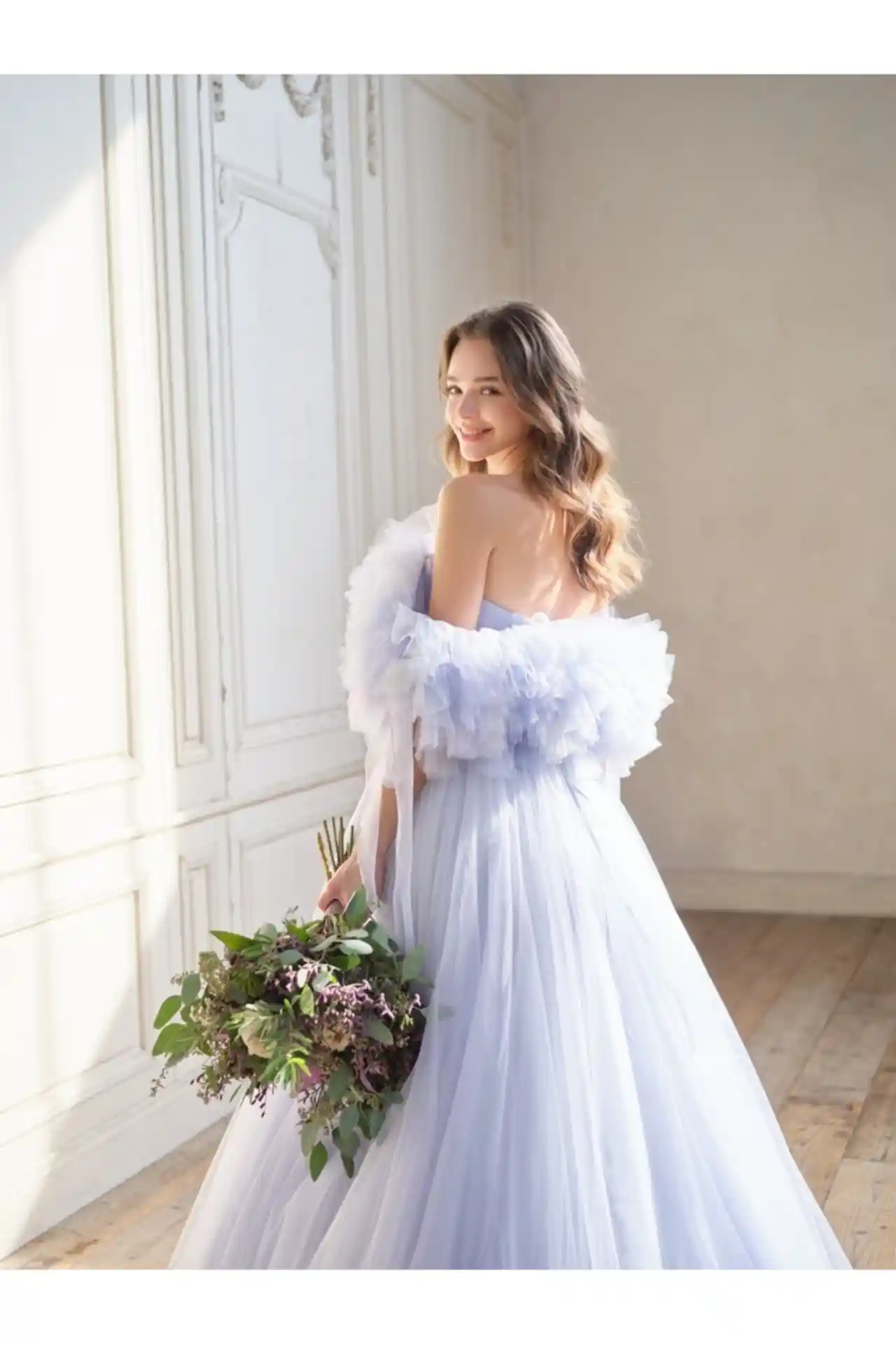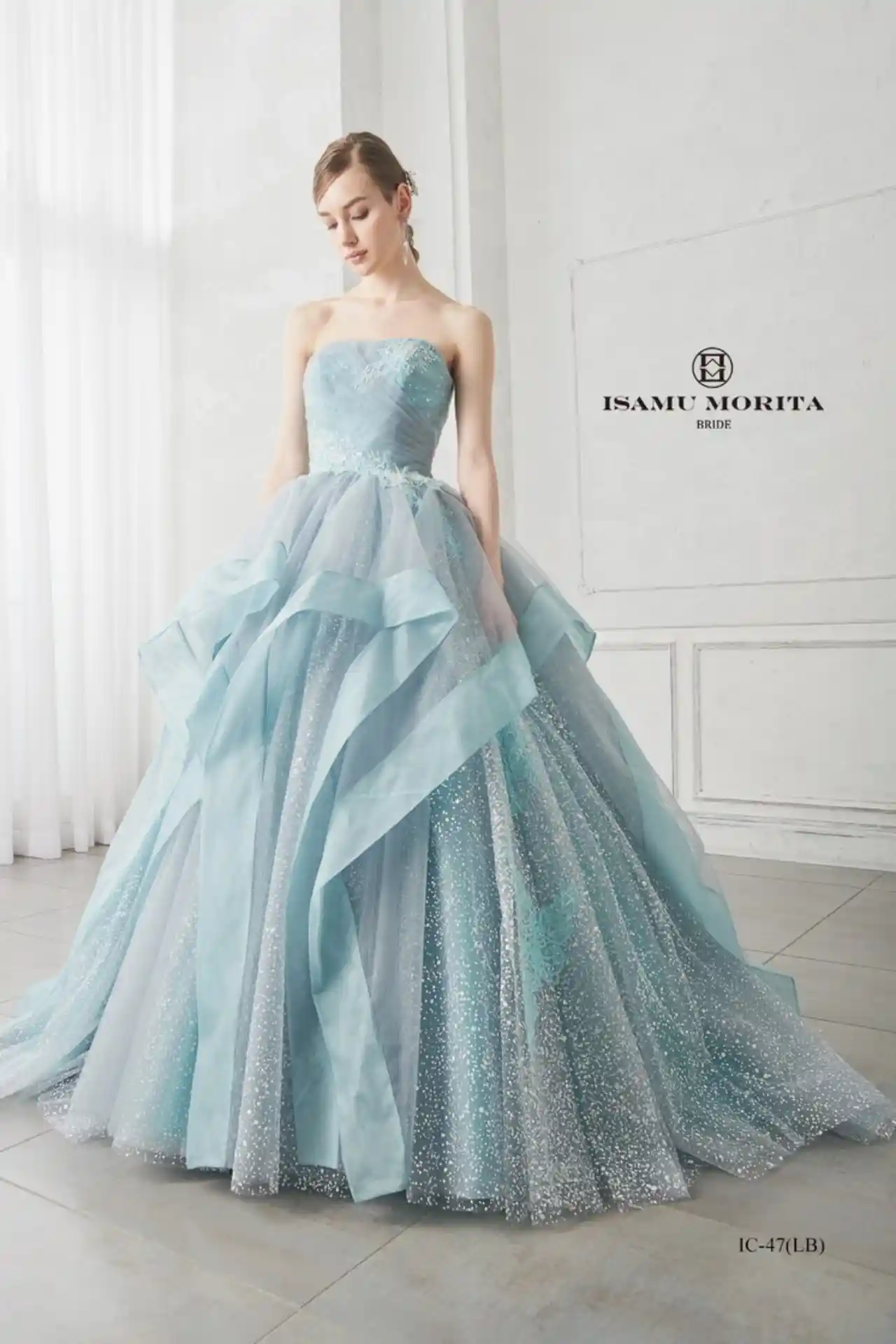 雪や氷のプリンセスを思わせるブルードレスは真冬に人気のカラードレス。グリーンよりのブルーを選ぶのがコーディネートのポイント!2025年も引き続きブルードレスが人気なので、トレンドを取り入れたい人にもおすすめです。