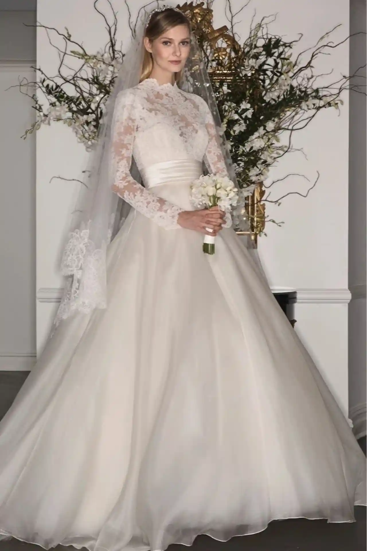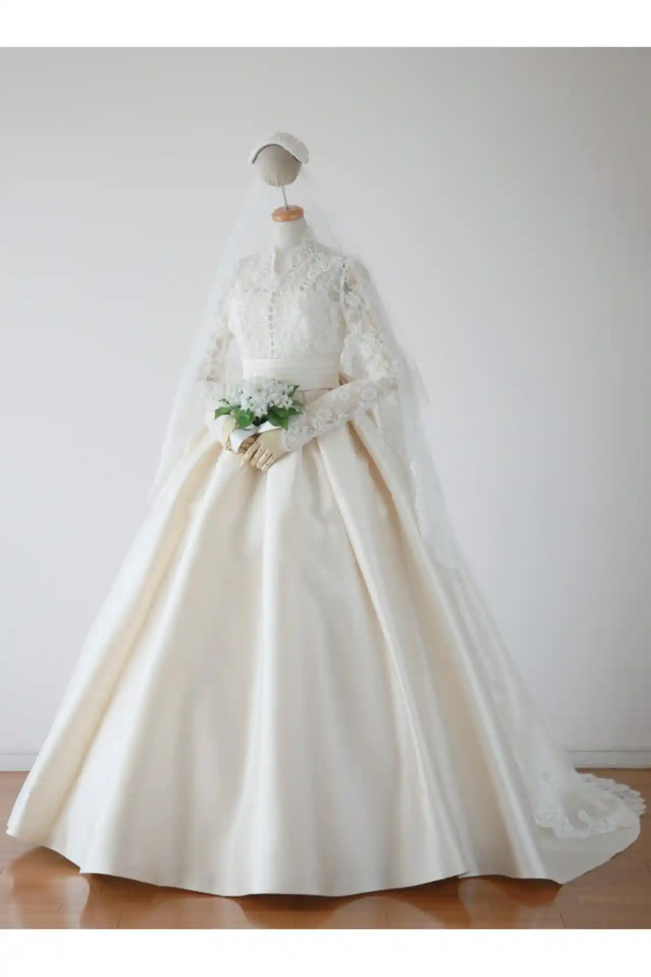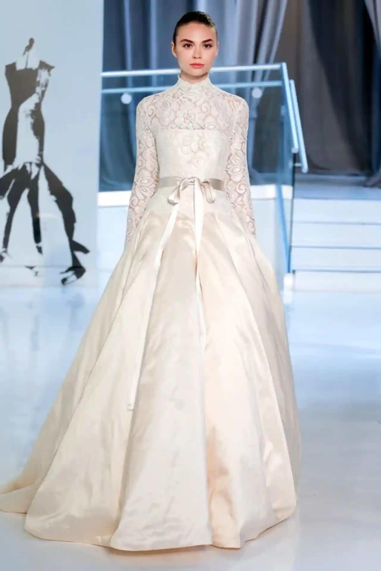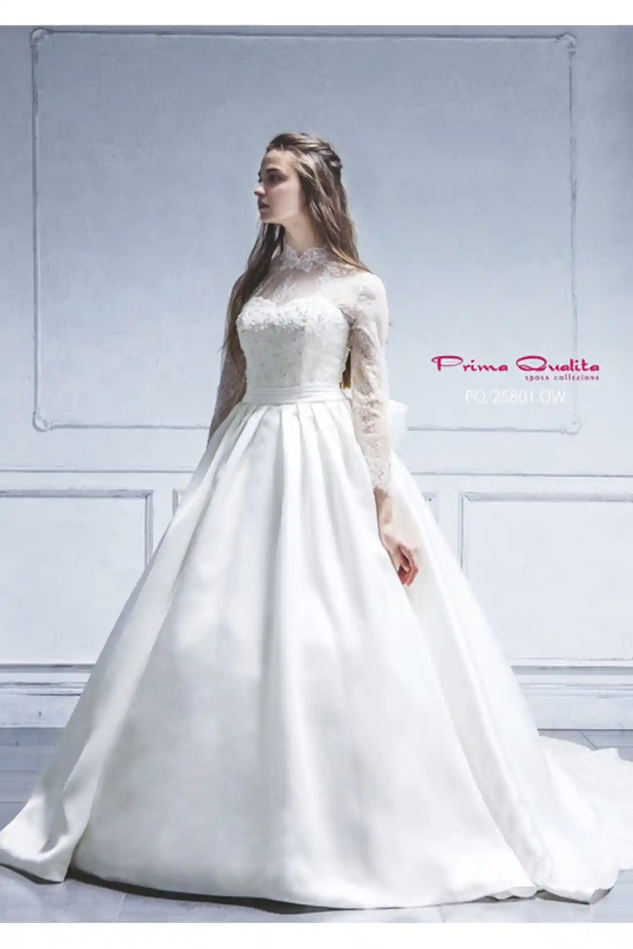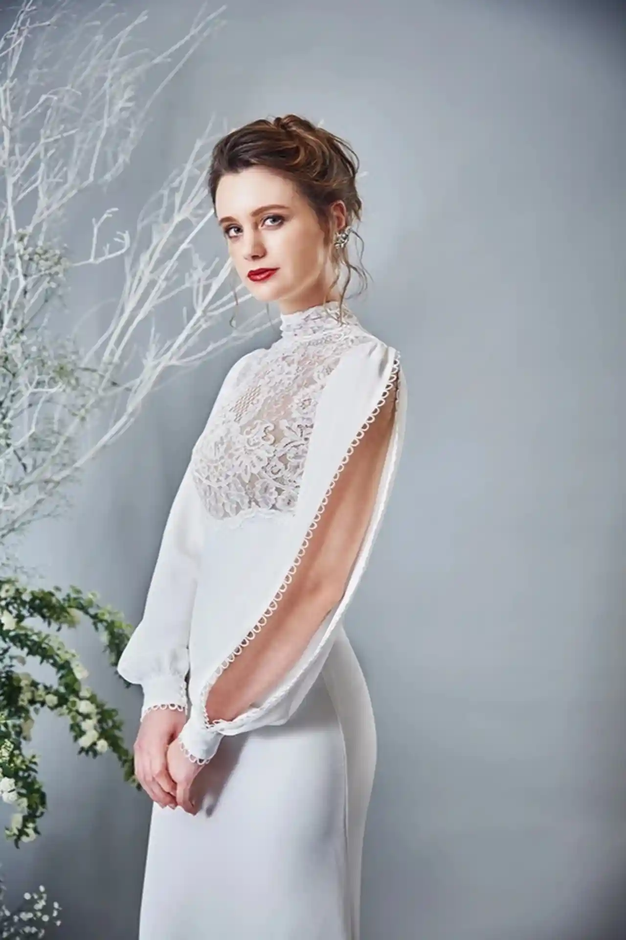 寒い時期に着たいのはハイネック×ロングスリーブのドレス。透け感が少ない生地でも暑苦しくならず、自然に着こなせるのがメリットです。ノーブルな雰囲気は大聖堂や趣のある洋館など、クラシカルな会場によく似合います。