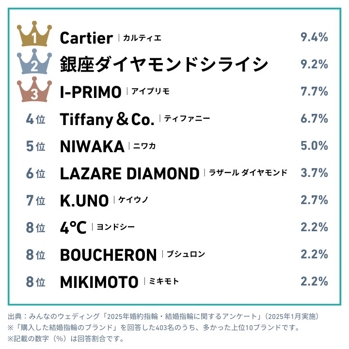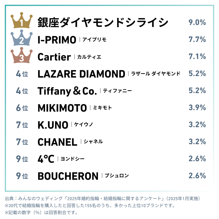 人気は銀座ダイヤモンドシライシとカルティエ!年代を問わず支持されています。ニワカやアイプリモなどのブライダルリング専門店も上位にランクイン。