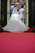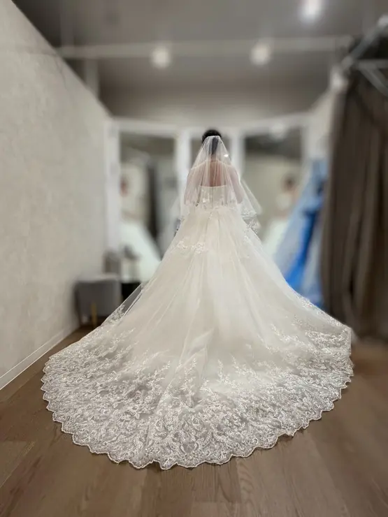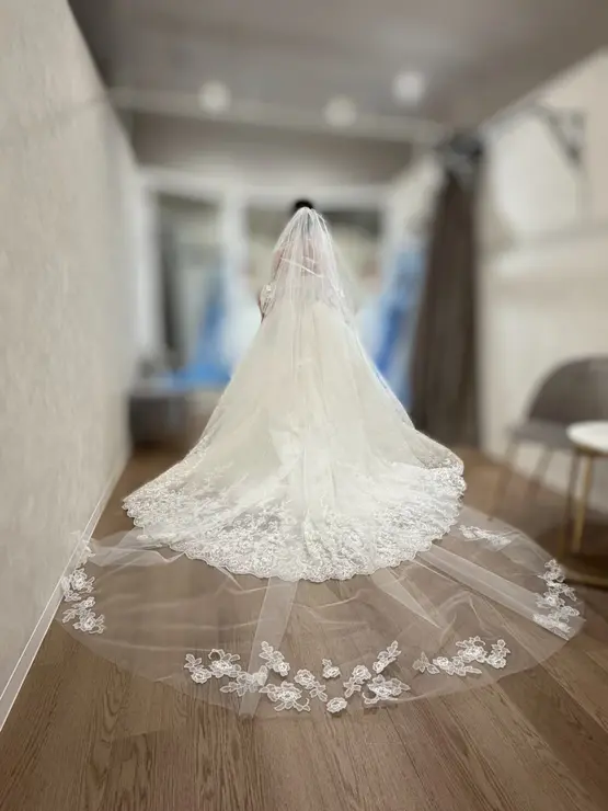 個人的にはチャペルの階段の下までトレーンが届いている&裾の刺繍がお気に入りであればショートヴェールがいいと思います。
