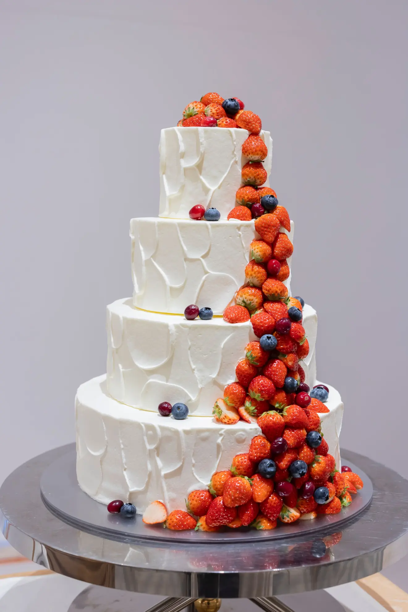 フルーツいっぱいのケーキにしました!私たちは王道の高さのあるウェディングケーキにしたかったので、このケーキに即決しました。