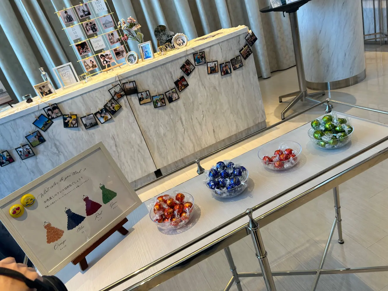 色当てクイズは定番でしたが、絶対にやりたい演出でした。定番だからこそ何を使おうか悩んでいましたが、プランナーさんが前職で扱っていた商品を使ったら参列者も喜んでくれるのではないかと提案してくださり、リンドールを使いました。前職の参列者はもちろん、外れても当たっても食べれるというという点で、皆さんに喜んでもらえて嬉しかったです。