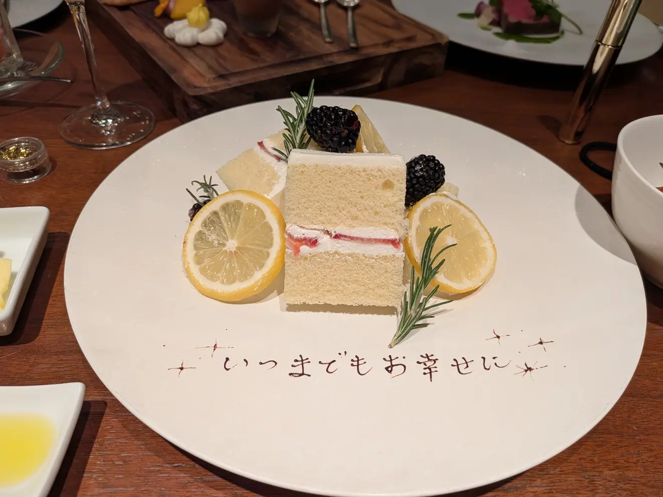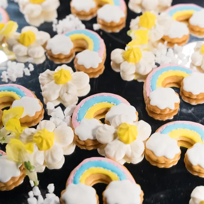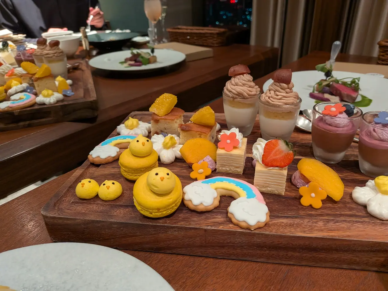 スイーツビュッフェで出していたものをアフターダイン(新郎新婦での食事)にてお出しいただきました。ひよこのマカロンや、お花のメレンゲ、ケーキ乗ったお花のチョコ、どれもしっかり見て美味しく食べることができてうれしかったです。