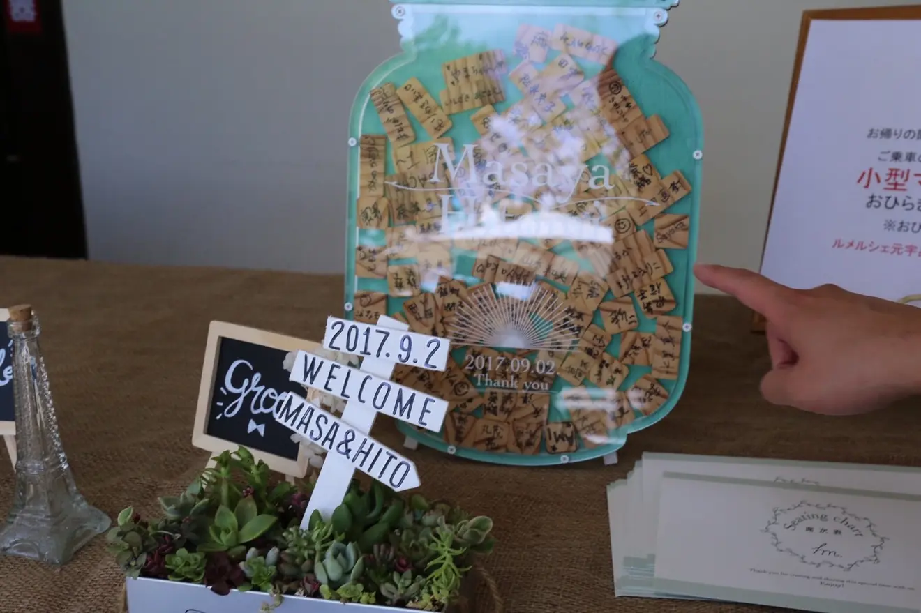 席札はこだわりの、多肉植物!デニムにスタンプを押し、名前をつけました。一つひとつ育てて、小さな鉢に入れ、気持ちをたくさん込めた席札です!水で固まる砂を入れたことで、持ち帰りやすいようになりましたよ!!