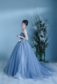 フリルやリボン、ドレープなどを用いて女性らしいシルエットがエレガントに表現されています。