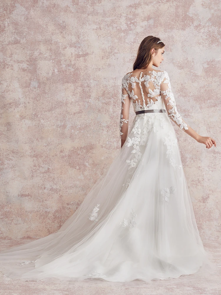デコルテを美しく魅せる大きく開いたVネックやバックコンシャスな背中のデザインなどインポートテイストが魅力。ソフトマーメイドラインのサテンにAラインのチュールスカートのレイヤーも美しい一着です。パニエ不要なのでリゾート挙式にもおすすめです。