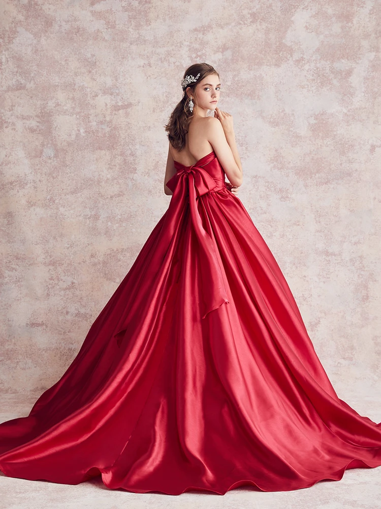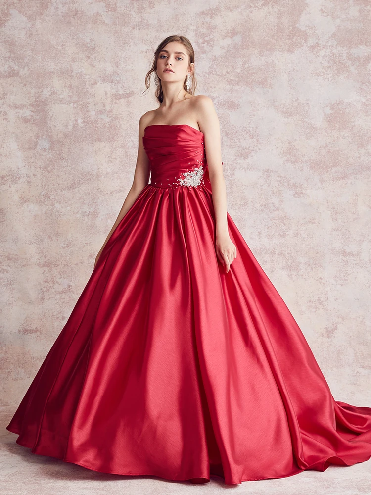 ローズカラーのシャンタンの素材感が活きるシンプルに仕上げたリアルモードなカラードレス。シャープとエレガントが共存する洗練された雰囲気が魅力です。コンパクトな身頃とボリュームあるスカートのフィット&フレアなシルエットは、スタイルアップ効果も。さらにサイドのビジューがウエストラインを細くみせてくれます。