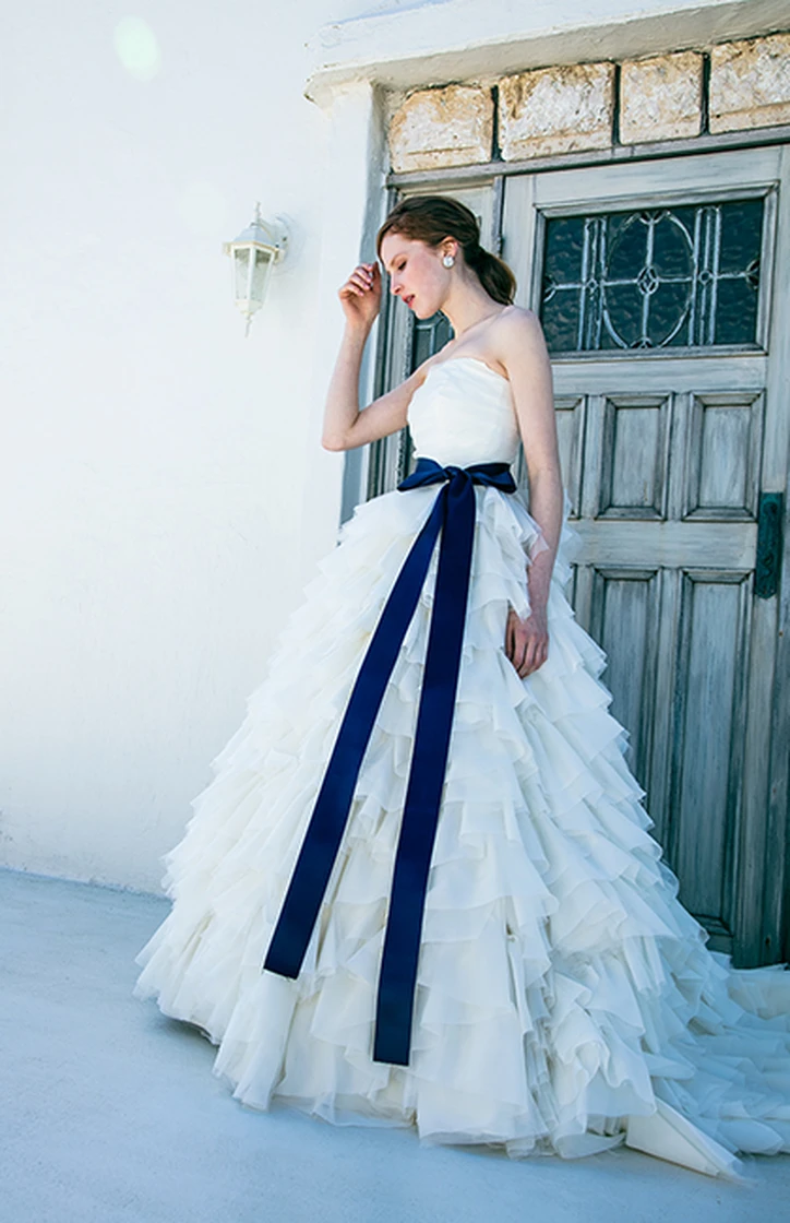 珍しいラインのビスチェタイプ。デコルテを綺麗に見せてくれます。スカート部分のフリルは華やかで上品なドレスです。