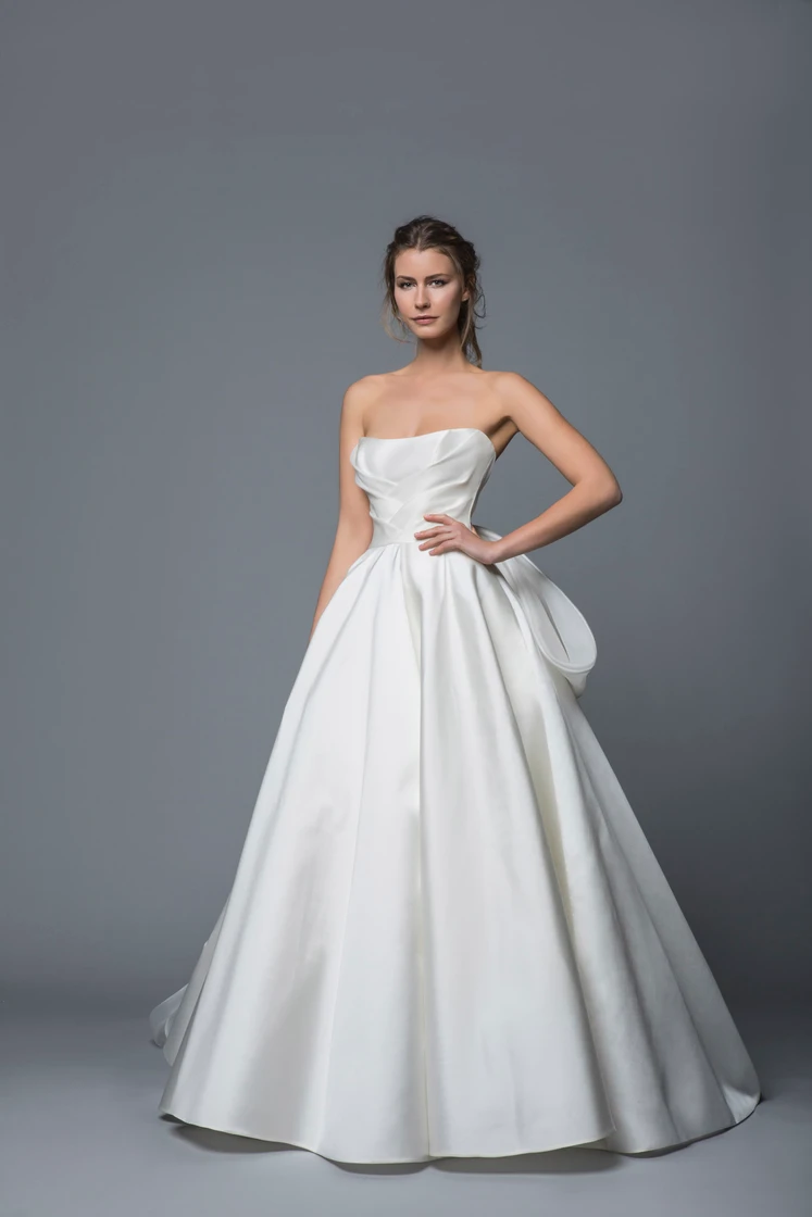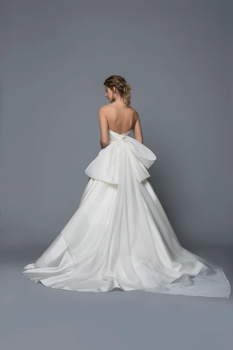 胸元が美しく上品な一着。バックスタイルは特徴的なリボンでゲストの視線を奪う。