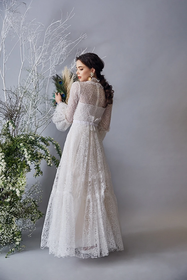 ロマンティックでありながら、見惚れるほど美しいディテール。 モックネックとボリュームのある袖は、ガウンをより現代的に見せます。