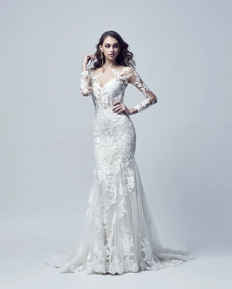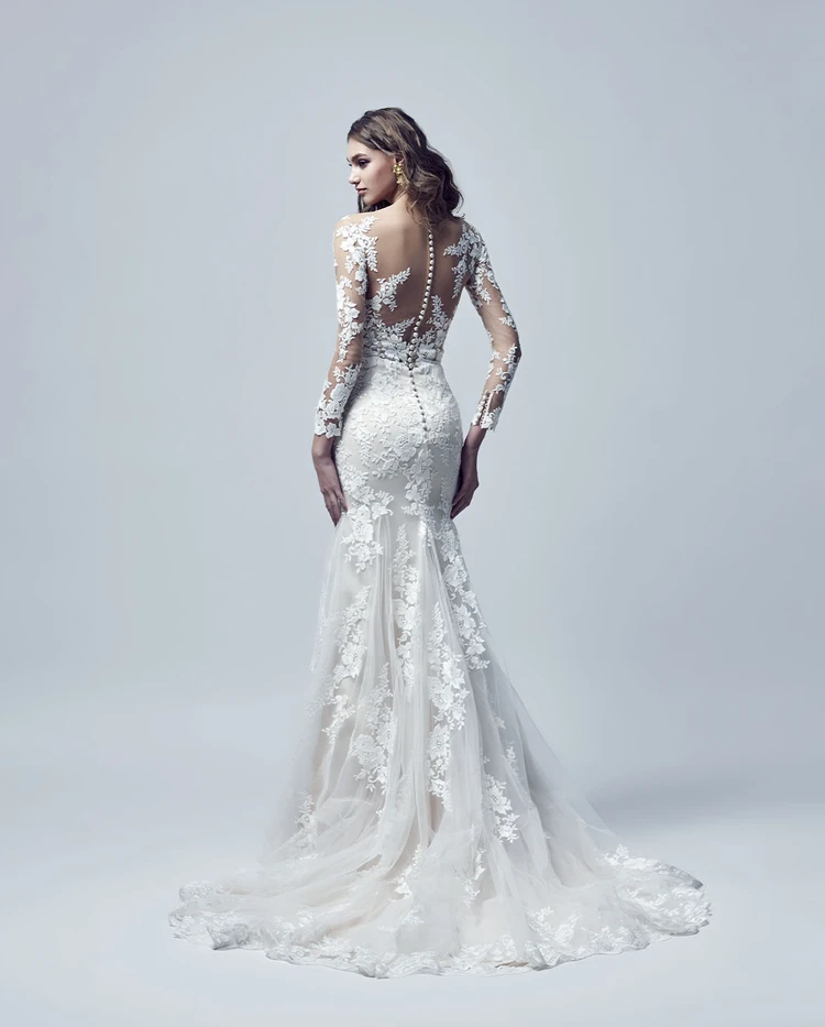 繊細かつ華麗なオーラをまとった、肌になじむヌードベージュのマーメドドレス。チュールのロングスリーブがモダンさを引き立たせます。