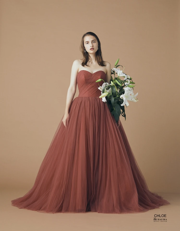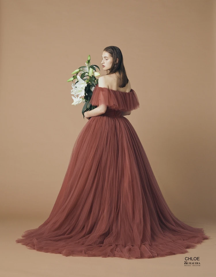 IM-0016 Chloe 日本の染色工房でオリジナルに染め上げたテラコッタの絶妙な色合いにプリーツ加工を施したソフトチュールをたっぷり使ったフォトジェニックなドレス。 オフショルダーのフリルやバックチュールトレーンなどお好みで合わせてアレンジして頂けます。