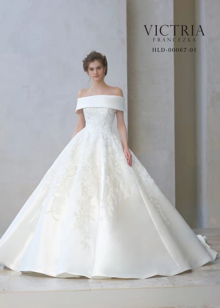 【VICTRIA PRINCEZKA】HLD-00067-01 オフホワイト 光沢とハリのあるミカド素材に、クラシカルなコードレースとグリッターを合わせた高級感のあるウェディングドレス。絶妙な幅のロールカラーは、デコルテや背中より美しく見せてくれます。贅沢に使用されたレース&グリッターのロングトレーンも、ドラマティックなバックスタイルを演出してくれます。 ロールカラーとロングトレーンは取り外し可能なので、お好みのスタイルをお楽しみいただけます。