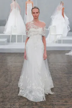 クリーンで潔い、シルクタフタのマーメイドドレス。取り外しが可能なオーバースカートを合わせるとロングトレーンのバックスタイルに。オフショルダーのデザインが優しくボディを包みます。