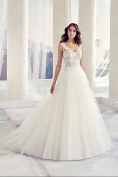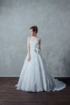 目を奪われるほど美しいシルクタフタを使用したウエディングドレス。 王道クラシカルで洗練された中にも、フロント部分はアシンメトリーなデザインを施すなどモダンさをプラス。 クラシカルとファッショナブルが融合したまさにRomona Keveza らしい逸品です。