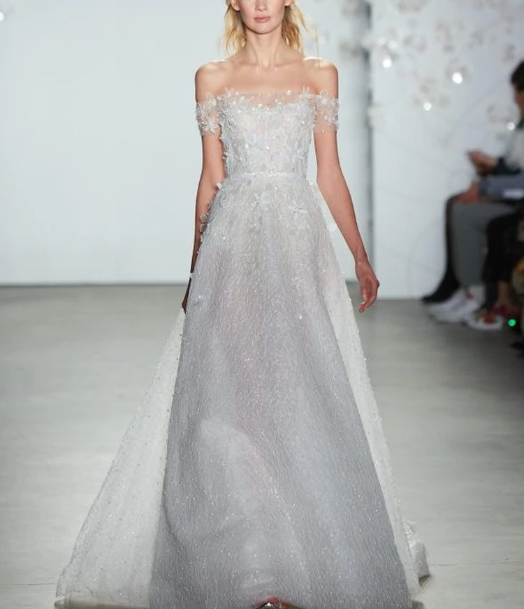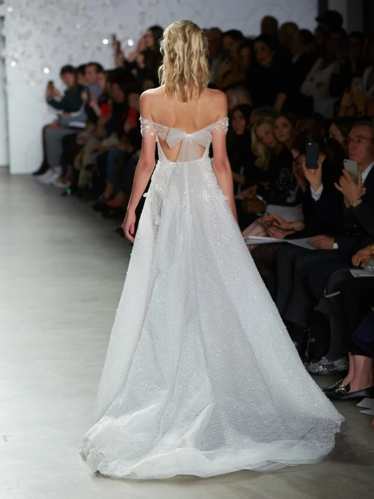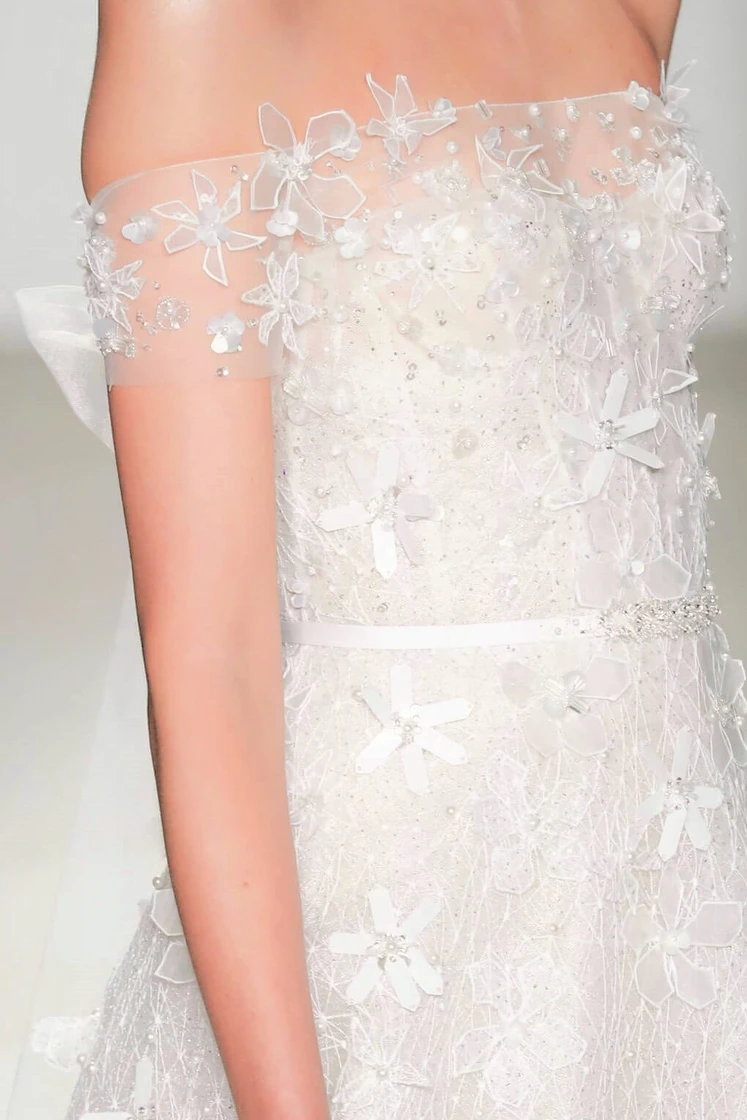トップスにあしらわれた3Dフワラーモチーフと、スカート全体にちりばめられたパールが繊細かつフェミニンな華やかさを放つ1着。 オフショルダーから背中に続く手結びのボウデザインが女性心をくすぐります。