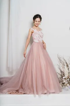 カッティングの美しさに心奪われるAラインドレスは、サテン地のしなやかさと上品な光沢感が、グレイッシュなピンクカラーをシックで上品に彩ります。シンプルでありながら華やかにデコルテを包むケープが、エレガントな雰囲気を醸し出してくれる一着です。