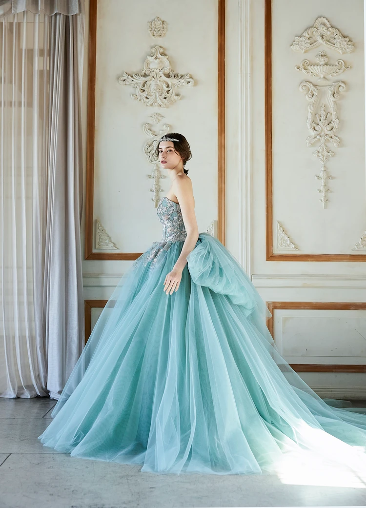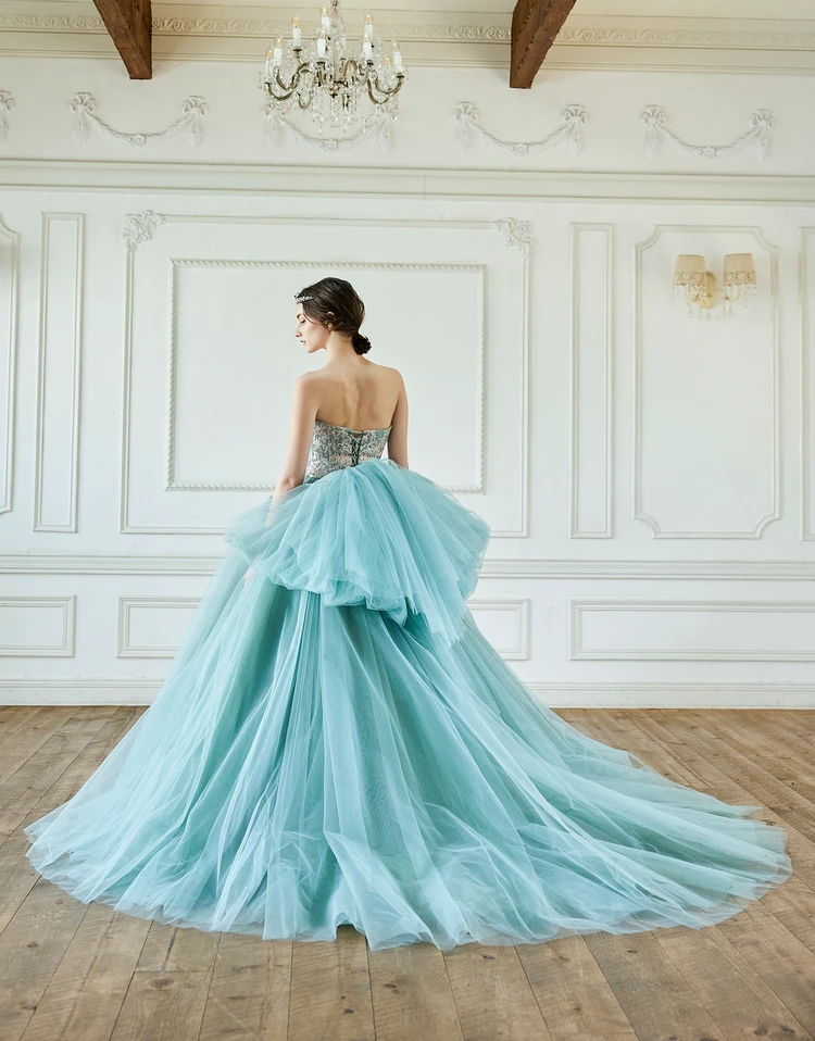 爽やかで軽やかなブルーグリーンのチュールドレスを、優しい色合いのフラワーレースで彩って。 妖精の羽根を思わせる大きなバックリボンが、よりいっそう可愛らしく印象的なブライズスタイルを演出します。