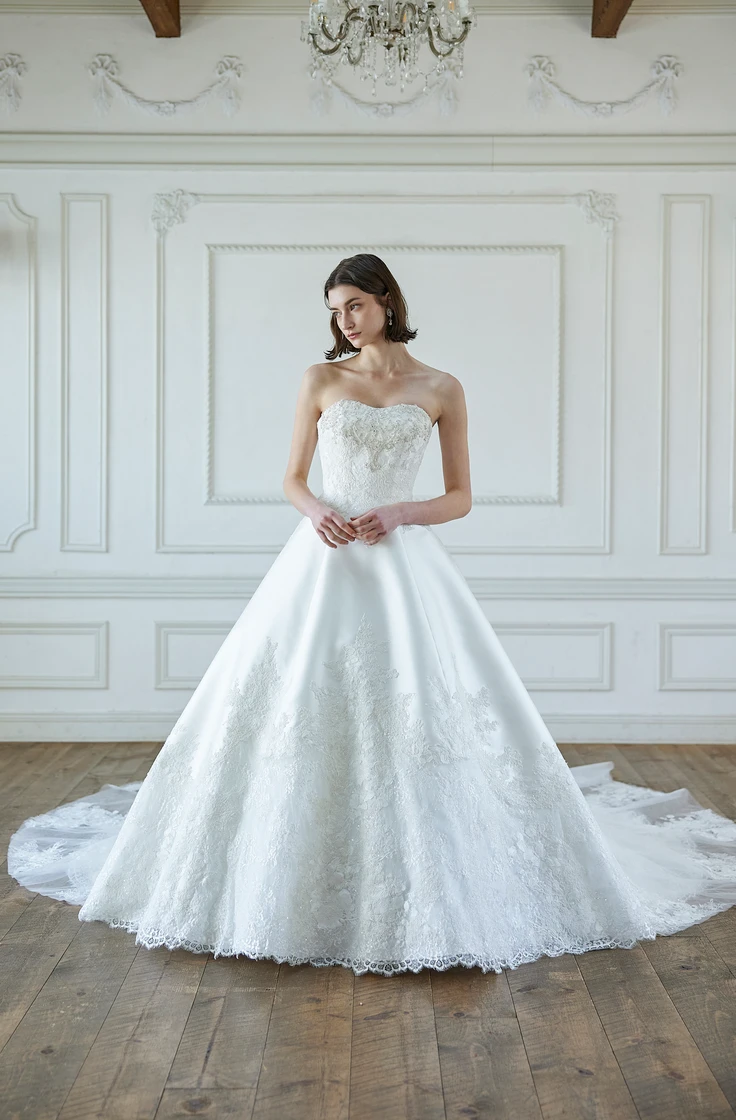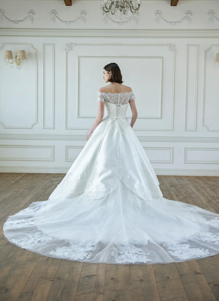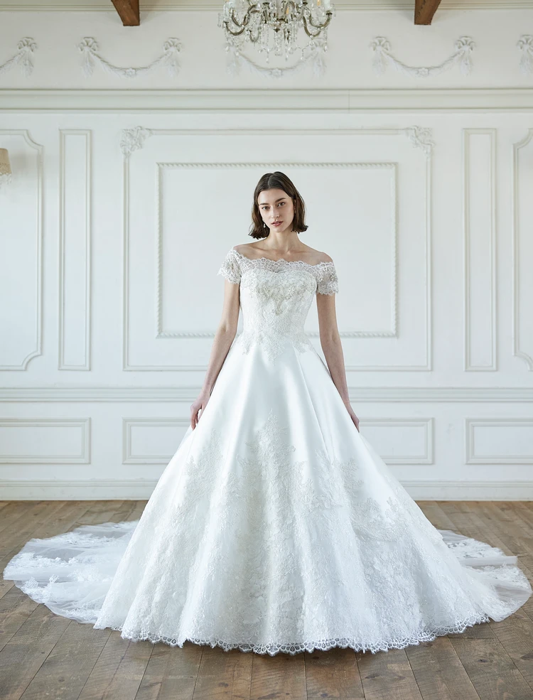 時代を超えて愛され続ける正統派のウェディングスタイル、王道のAライン&オフショルダーのドレス。 大柄のフラワーエンブレースとシルバーの刺繍レースをミックスさせて上品な煌きを生み、 トップスに散りばめたビジューでさらなる輝きを与えた優美な一着です