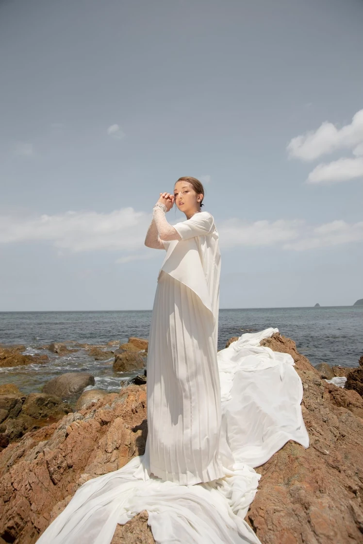 ワンピースドレスにオーバーキャミソールをプラス。 スレンダーなラインに胸元のフレアのバランスが新しいアクセントに。