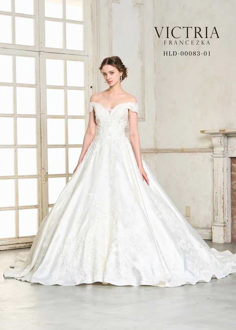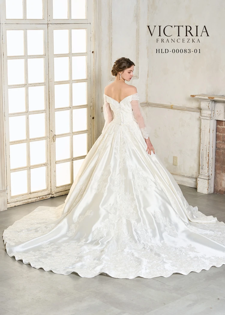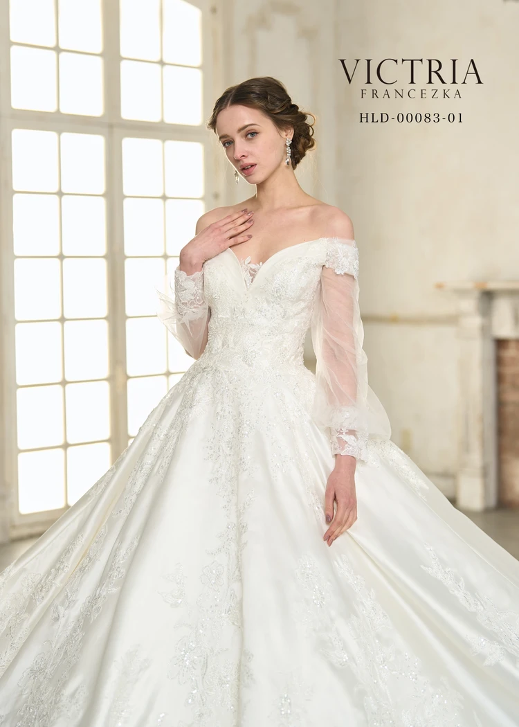 オフショルダーとビショップスリーブで2WAYの変化が楽しめる上品クラシック。デコルテを美しく見せるVカットネックライン。お袖はカフスのみの装飾で透明感のある仕上がり。スカートから立ち上がるボタニカル柄はクリアビーディングで上品な輝きで存在感を感じさせます。