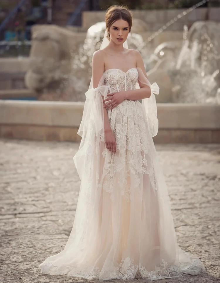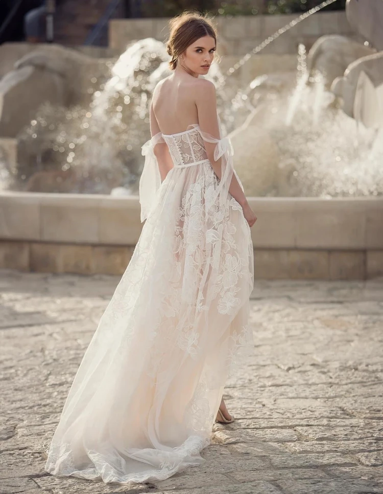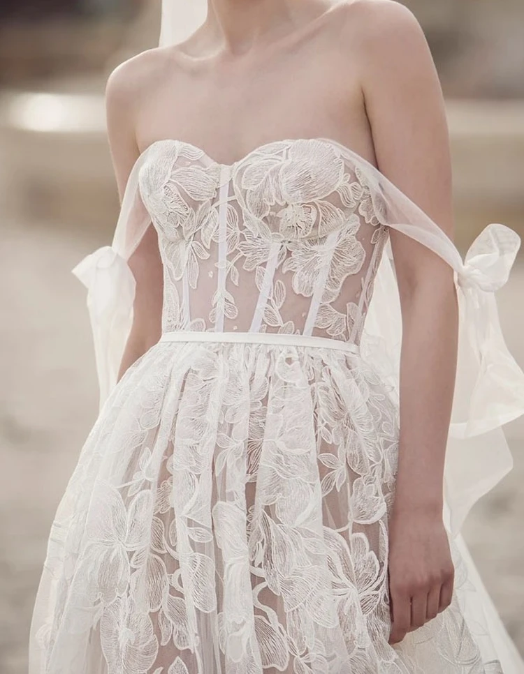 ウエスト部分が透け感のあるビスチェトップと、全体に施された華やかなお花の刺繍がとても美しい。 オフショルダーのオーガンジーのリボンも特徴的。