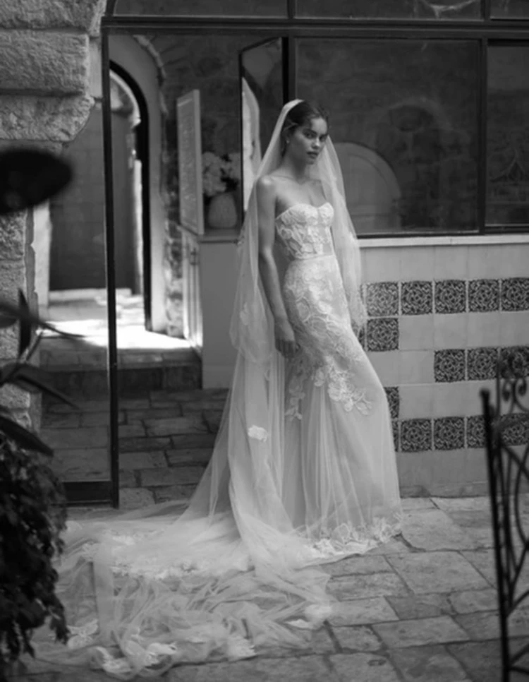 透け感のあるスレンダードレス。繊細な花の刺繍がロマンチックな印象に。 ボレロは取り外しができ、ビスチェタイプのドレスにすることもできます。
