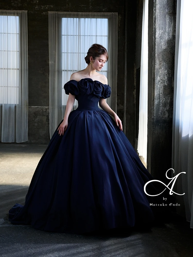 Millie/ ミリー HE-151(Navy) 胸元のフラワーモチーフが印象的なオフショルダードレス。 デコルテを華やかに飾ります。シンプルながら存在感のある1着。