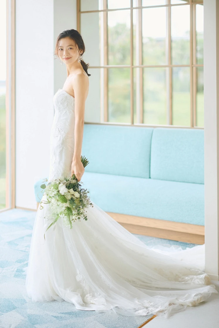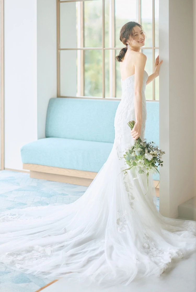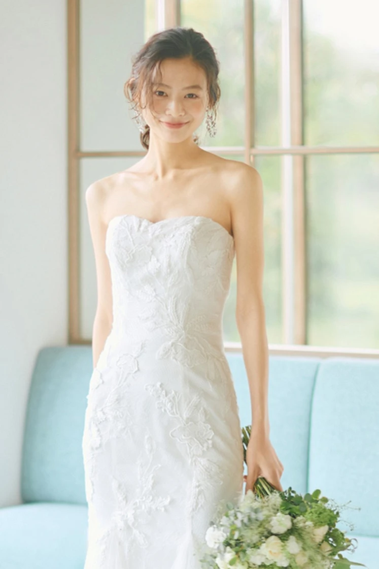 プンクタータ。花言葉「愛らしさ・誠実な愛」。 稲穂モチーフのエンブロイダリーレースがポイントのラインの美しさが際立つマーメイドラインのドレスです。デコルテをすっきりとみせるハートカットに、チュールをゴデットにたっぷりと使い、流れるように広がるスカートが、どこからみてもドラマチックな一着です。