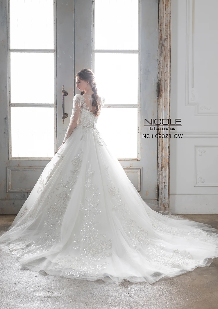 ボリュームショルダーのロングスリーブがポイントのウエディングドレス。輝き溢れる1着です。