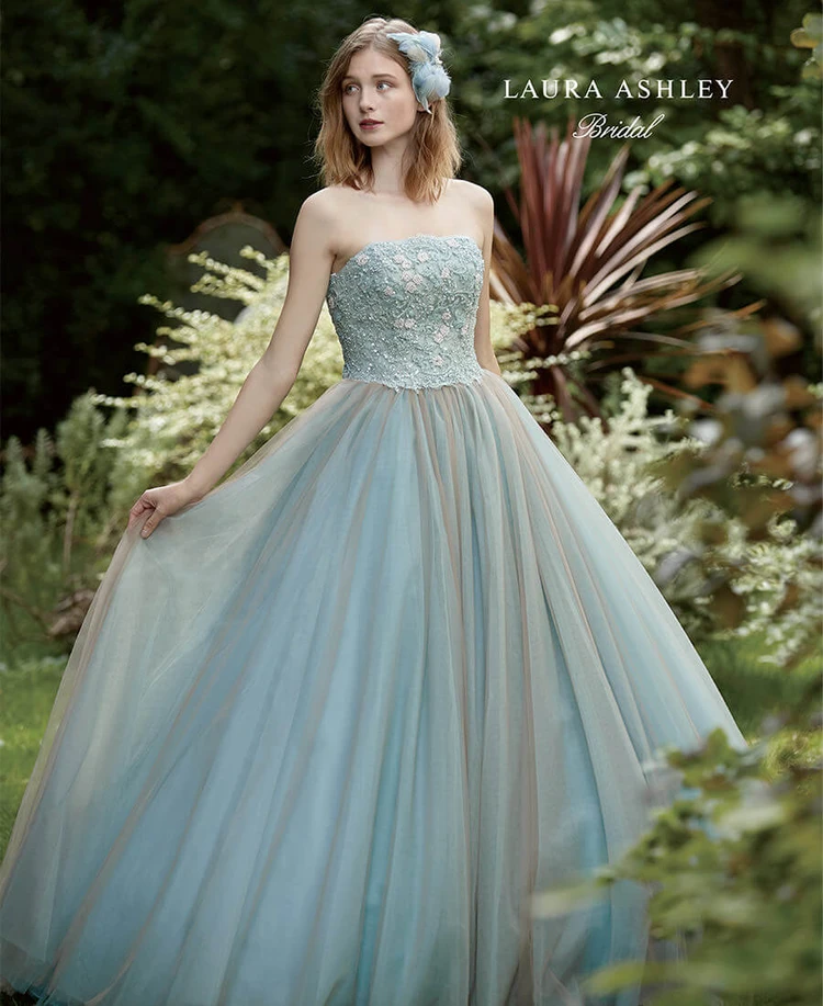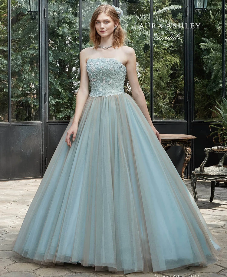 ベースのブルーのチュールにくすみカラーのブラウンを一枚重ねたおしゃれドレス☆彡胸元も豪華な刺繍で華やかさもばっちり!