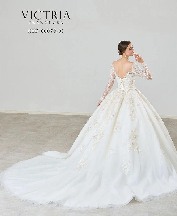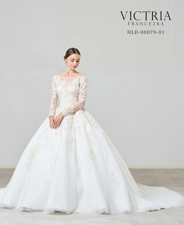 ビックAラインのシルエットが映えるドレスです。ドレス全体に透明なグリッター素材を使用し、トップスや、スカートの上に側にはオリジナルの柄で作られたゴールドとアイボリーのレースが存在感を与えます。ヨークや胸元部分にはビーディング施し。高級感を醸し出します。